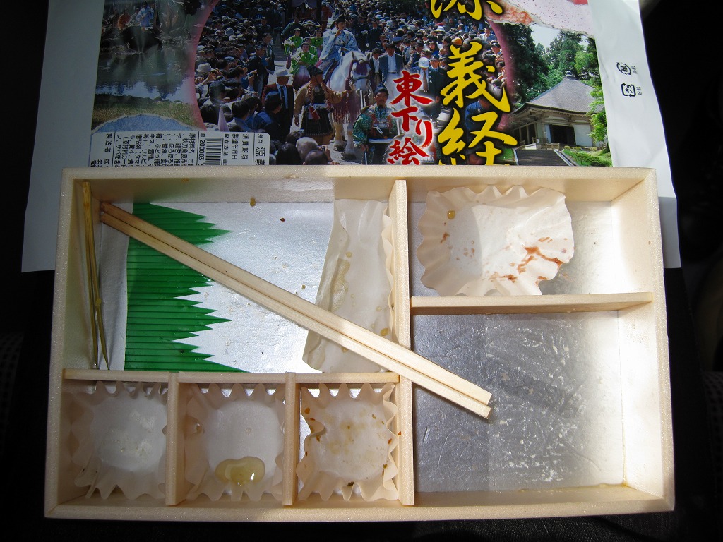 源義経が兄の頼朝に追われ、文治3年(1187年)に平泉に落ち延びた「東下り(あずまくだり)」のときに味わったであろう食材を用いたそうだが、内容的にちょっと信じがたい。でもその風味の良さは千百円の価値があると思うし、ドラマ効果の義経ブームが続く間は安泰だろう。2010年頃までの販売か。