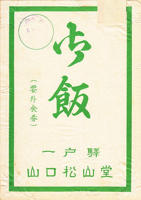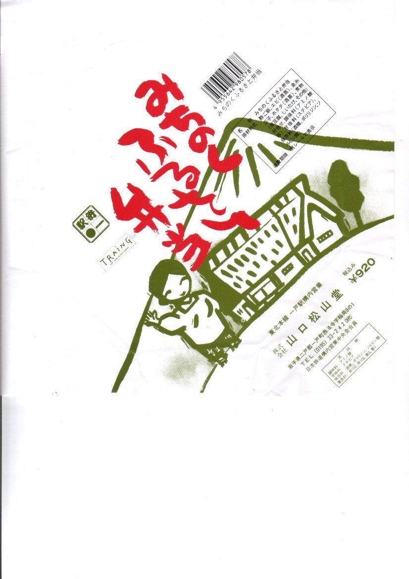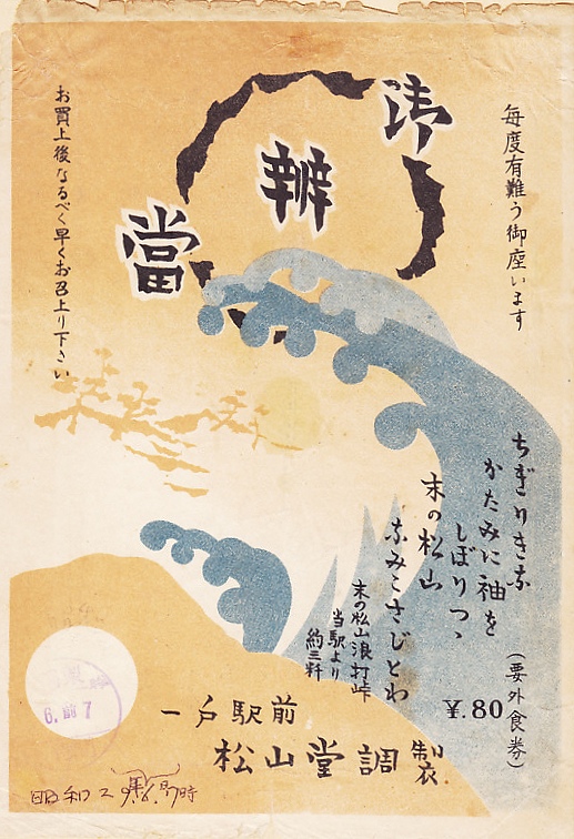 1950年代、昭和30年前後のものと思われる、昔の一戸駅弁の掛紙。収集者は1954(昭和29)年6月7日の調製とみなし、掛紙に書き入れた。「要外食券」当時のもの。掛紙に引用した百人一首の42番で清原元輔の歌「ちぎりきな かたみに袖を しぼりつつ 末の松山 なみこさじとわ」における末の松山(すえのまつやま)は、普通に調べると宮城県多賀城市にある国指定名勝「おくのほそ道の風景地」25箇所のひとつとなるが、現在の岩手県の一戸町と二戸市にまたがる奥州街道の浪打峠だとする説もあり、これが「末の松山浪打峠当駅より約三粁」と紹介される。この峠で1987(昭和62)年11月に開通した岩手県の農林漁業用揮発油税財源身替農道(農免農道)のトンネルは「末の松山トンネル」と名付けられた。1933(昭和8)年4月に山口良助が創業した調製元の屋号「松山堂(しょうざんどう)」は、これにちなんだものだろうか。