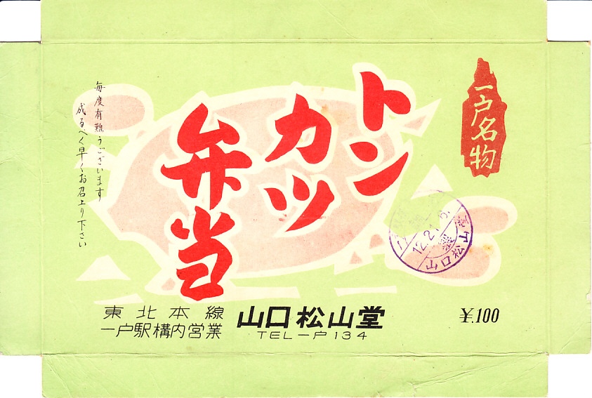 1960年代の、12月21日6時の調製と思われる、昔の一戸駅弁のふた。「一戸名物」の標記に偽りや盛りはなく、一戸駅のとんかつ弁当は東北本線の旅客に親しまれた。今見ればこの文字は、千葉駅のトンかつ弁当に似ていると思う。