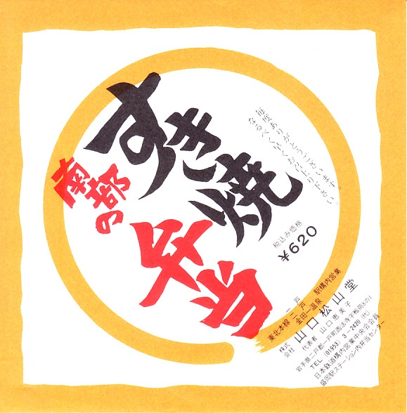 1990年代のものと思われる、昔の一戸駅弁の掛紙。1975年頃に「南部すきやき鍋」として発売し、1990年過ぎまで販売か。商品名を記しただけの、シンプルな絵柄。