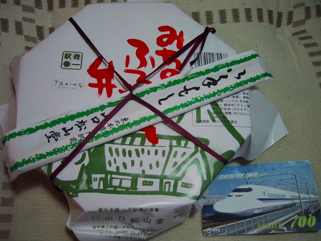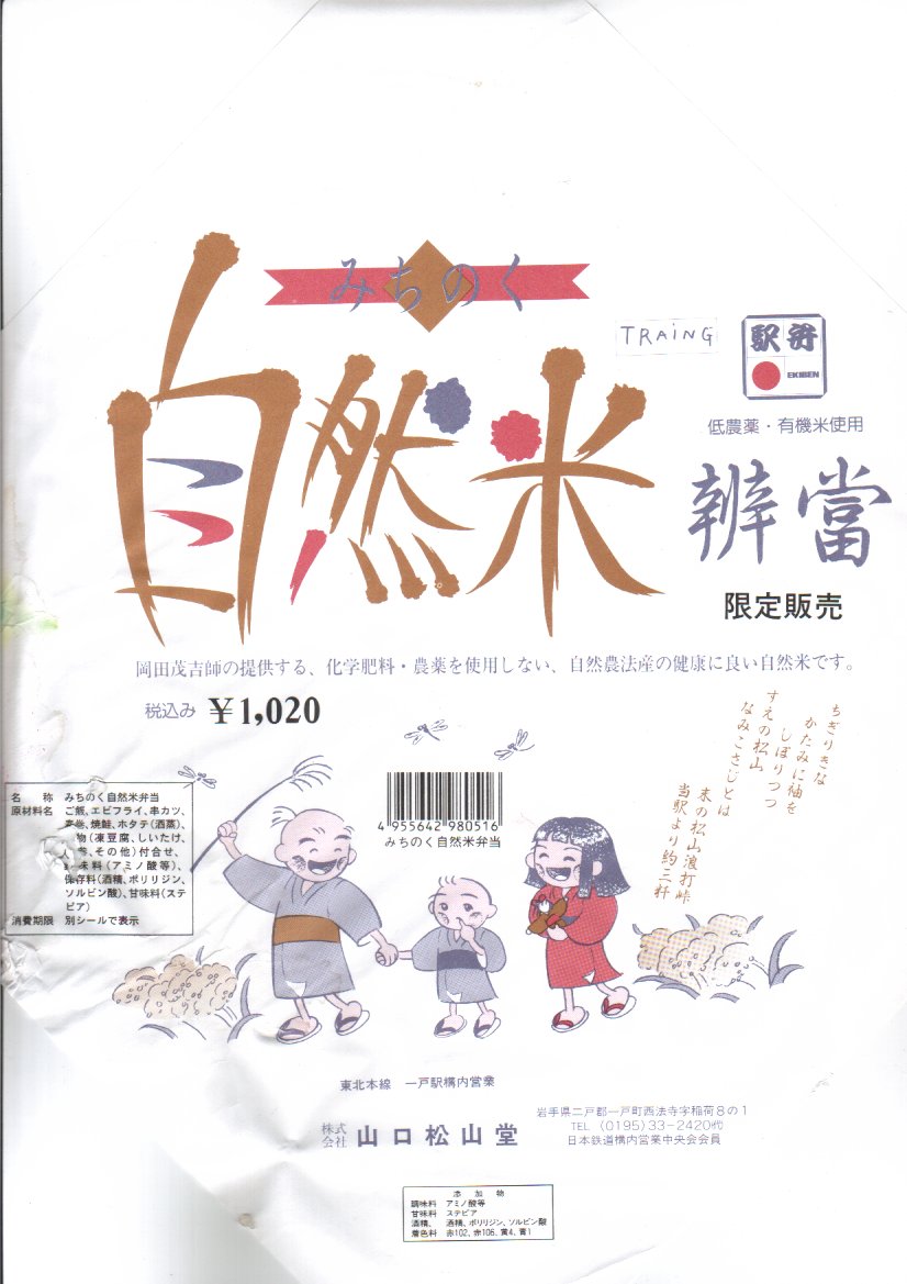 「岡田茂吉師の提供する、化学肥料・農薬を使用しない、自然農法産の健康に良い自然米です。」だそうな。中身はつまり幕の内弁当で、日の丸御飯に焼鮭、ホタテ、串カツ、エビフライ、煮物、ごぼうサラダ、漬物など。上記の駅弁「みちのくふるさと弁当」と同じく、おかずがあふれるように詰められていた。