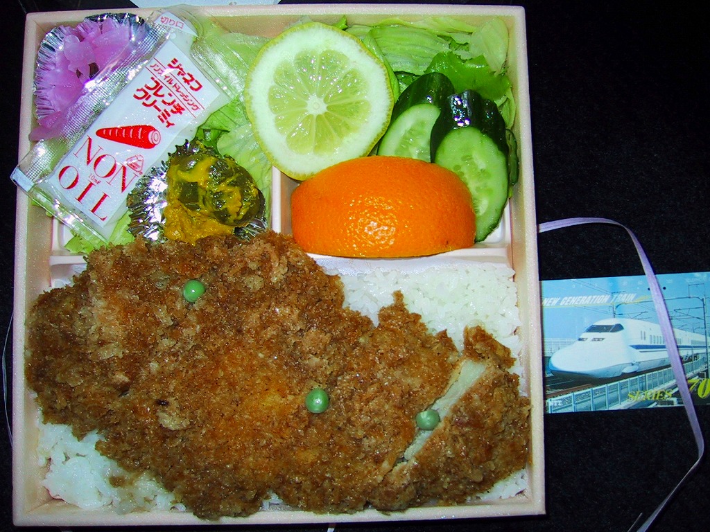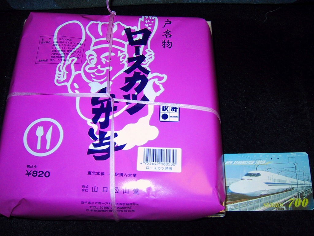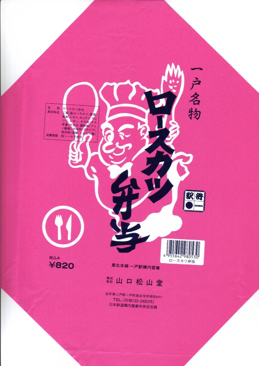 1960(昭和35)年頃に一戸駅で発売。「トンカツ弁当」やこの「ロースカツ弁当」は、名物としてこの駅や東北本線の列車内販売で親しまれた。一戸の特産という豚肉を使用、白飯に秘伝という醤油だれに漬けたロースカツを1枚横たえ、グリーンピースで彩り、野菜と柑橘類と漬物を添える。トンカツの駅弁では珍しく、彩りが豊か。