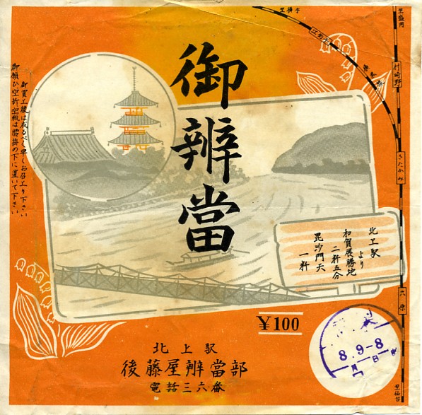 昭和30年代の、8月9日8時の調製と思われる、昔の北上駅弁の掛紙。黒沢尻駅が「北上」に改称されたのが1954(昭和29)年3月で、横黒線が「北上線」に改称されたのが1966(昭和41)年10月なので、掛紙の路線図を見るとその間のものだろう。尻の字が嫌われて駅名や路線が変わったが、黒沢尻の名は今も町名や高校名に残る。