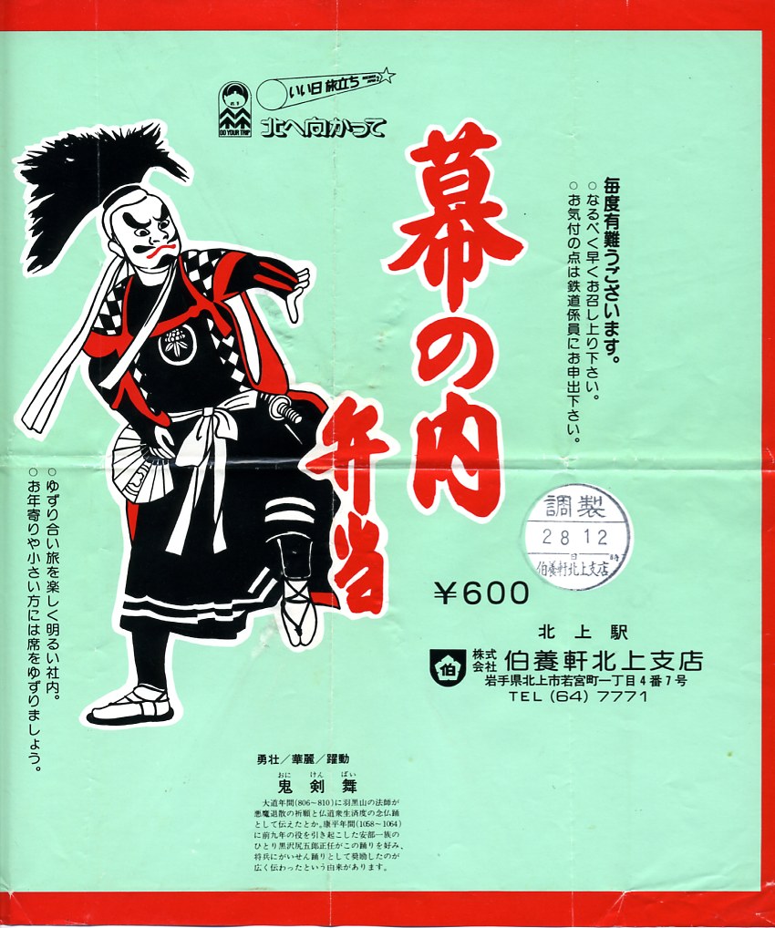 1980年代の、2月8日12時の調製と思われる、昔の北上駅弁の掛紙。かつて北上駅弁の名前に使われたこともある、岩手県北上の伝統芸能「鬼剣舞(おにけんばい)」とその説明が描かれる。