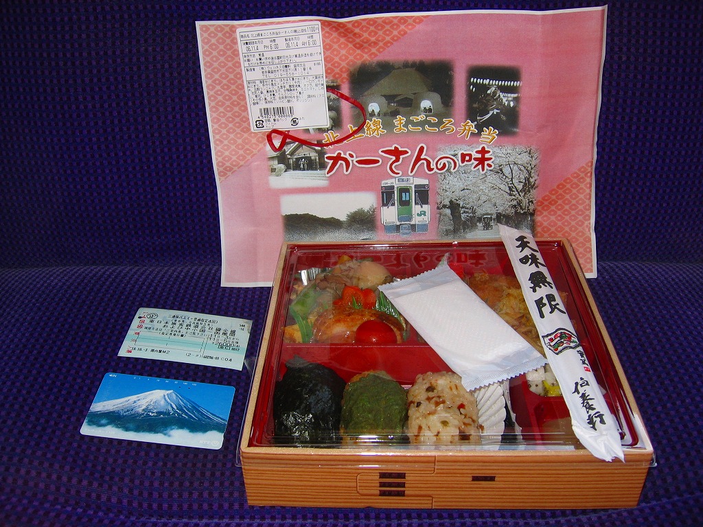 2006(平成18)年に発売か。大きめの容器に透明なふたをして、A4判カラーコピーの掛紙をかけて、輪ゴムで留めてから食品表示ラベルを貼る。中身は小柄な白飯おにぎり、ほろほろ漬おにぎり、大葉焼きおにぎりと、牛メンチカツ串、かき揚げ、舞茸その他の煮物、合鴨桑焼に玉子焼、とろろいもにリンゴシロップ漬けなどと盛りだくさん。