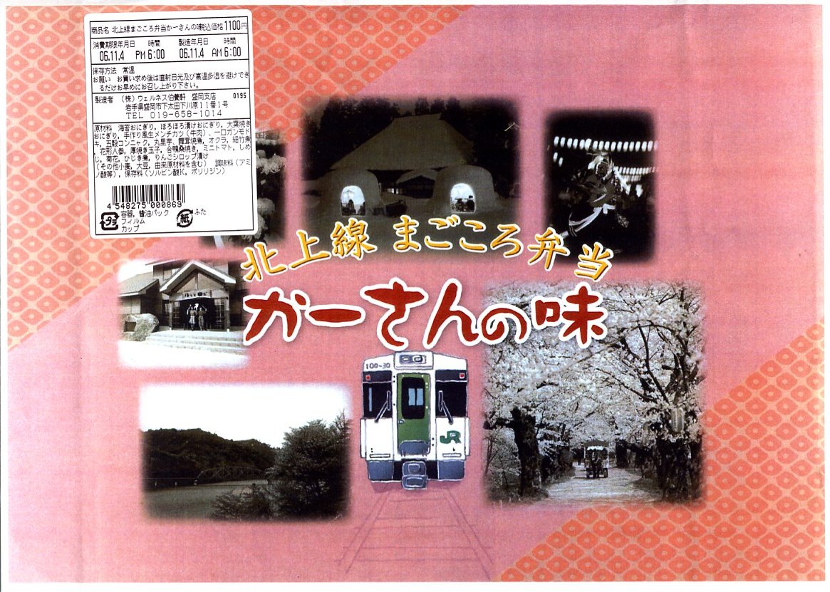 東京駅から新幹線やまびこ号で約3時間。北上市は岩手県の南西部で北上盆地に位置し北上川に面した、人口約9万人の工業都市。古来から交通路であったが、国道や鉄道の整備、高速道路と新幹線の開通で、工業団地が形成され栄える。駅弁は明治時代から営業した後藤屋が2000年頃に撤退、伯養軒の支店があったが2005年に撤退、以後は盛岡駅の駅弁が駅そば屋に入荷したが2020年に閉店、その後は近隣の駅弁がコンビニに入荷する。1890(明治23)年11月1日開業、岩手県北上市大通1丁目。