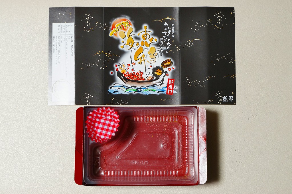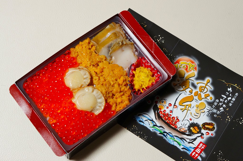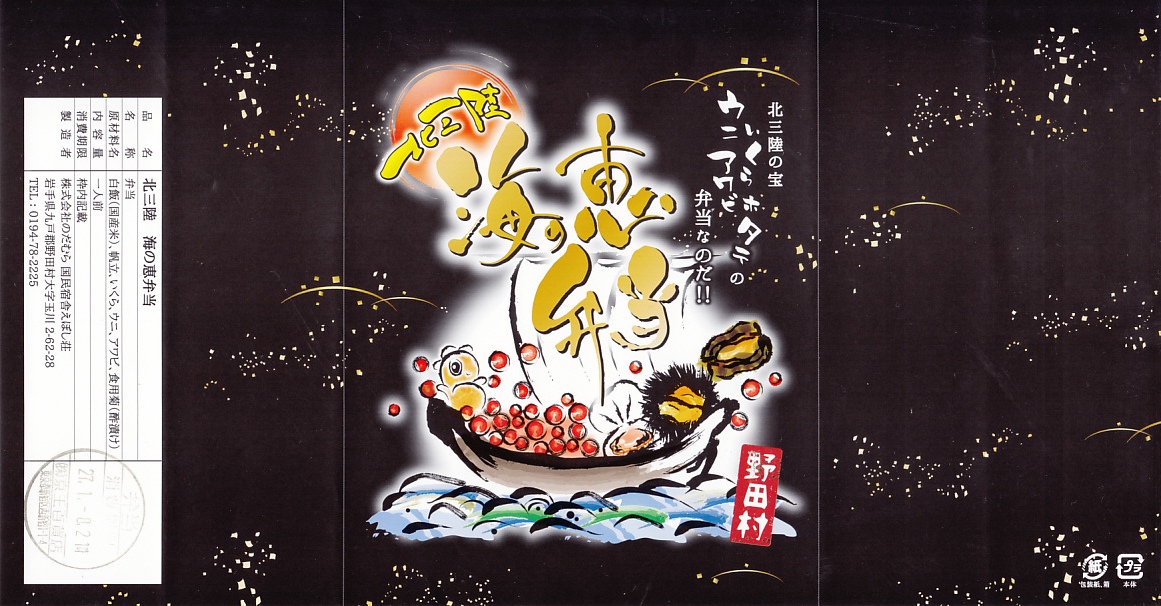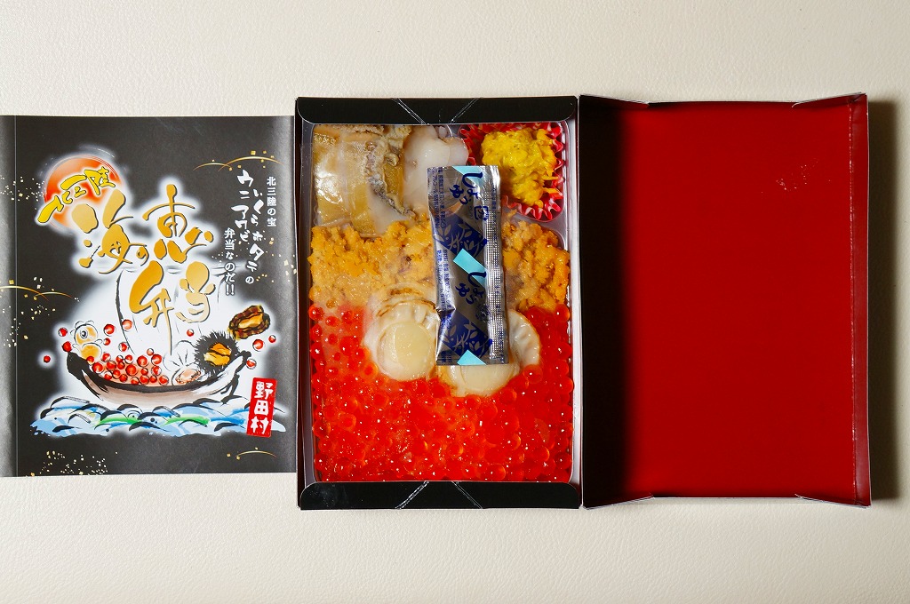 2015(平成27)年1月の京王百貨店の駅弁大会で、陸中野田駅の駅弁として実演販売。現地の道の駅でも、1月8日の開会から一日10個を、1月31日までの期間限定で販売したという。白御飯を、上記の「鮭いくら弁当」のイクラとホタテと、さらにウニとアワビで覆い、食用菊と醤油を添付。黒い掛紙のイラストが楽しく、輝かしい中身。イクラの塩気、ホタテのぷりぷり、ウニの滋味、アワビの臭みは、駅弁にも海鮮弁当にもない感覚で、久慈のうに弁当に負けず劣らずという感じ。以後の販売は、なかった模様。