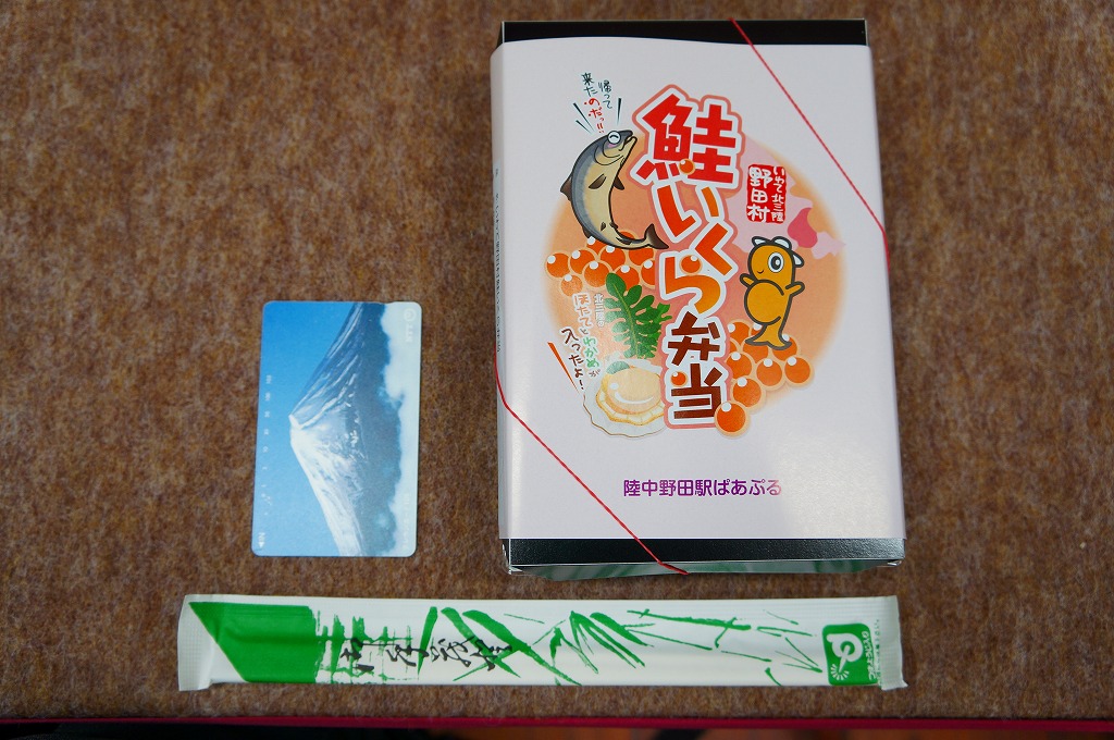 久慈駅から三陸鉄道北リアス線で2駅13分。野田村は岩手県で太平洋に面した人口約4千人の村で、かつては製塩や砂鉄で栄え、今は農業と漁業と観光で生きる。2012年1月の京王百貨店の駅弁大会に出品するため、駅舎の機能も持つ道の駅で駅弁が誕生した。1975(昭和50)年7月20日開業、岩手県九戸郡野田村大字野田。