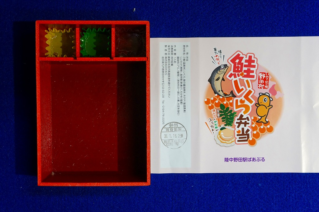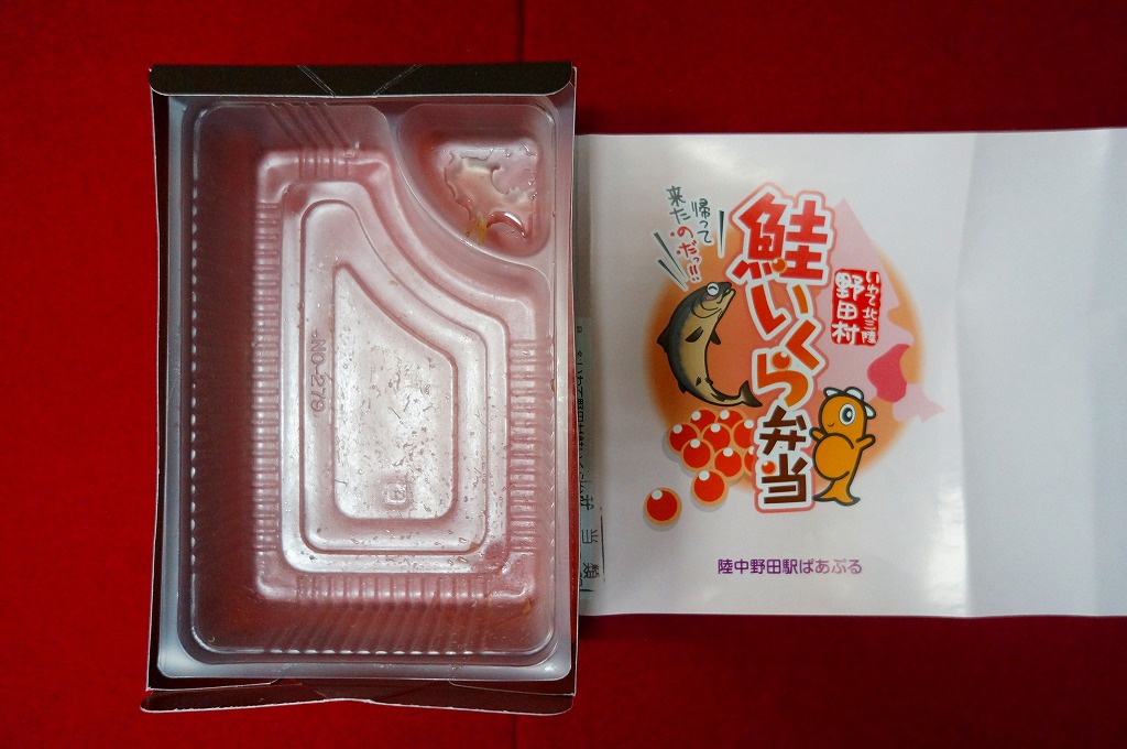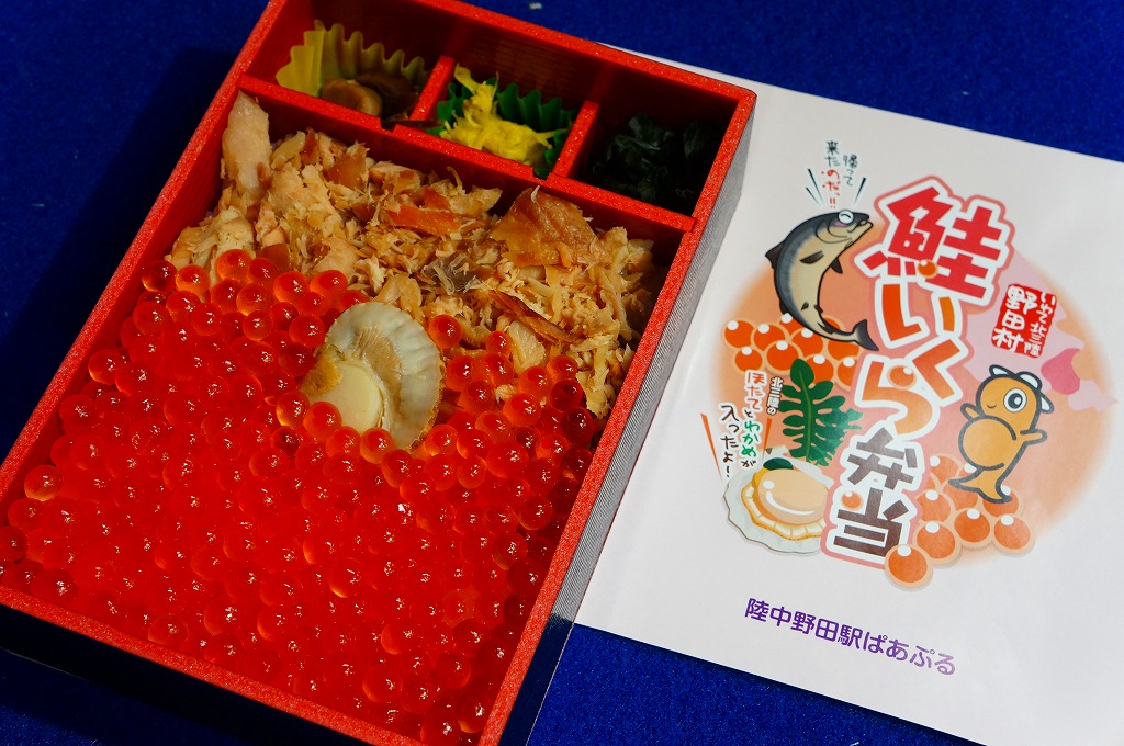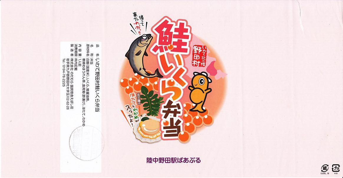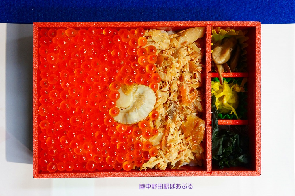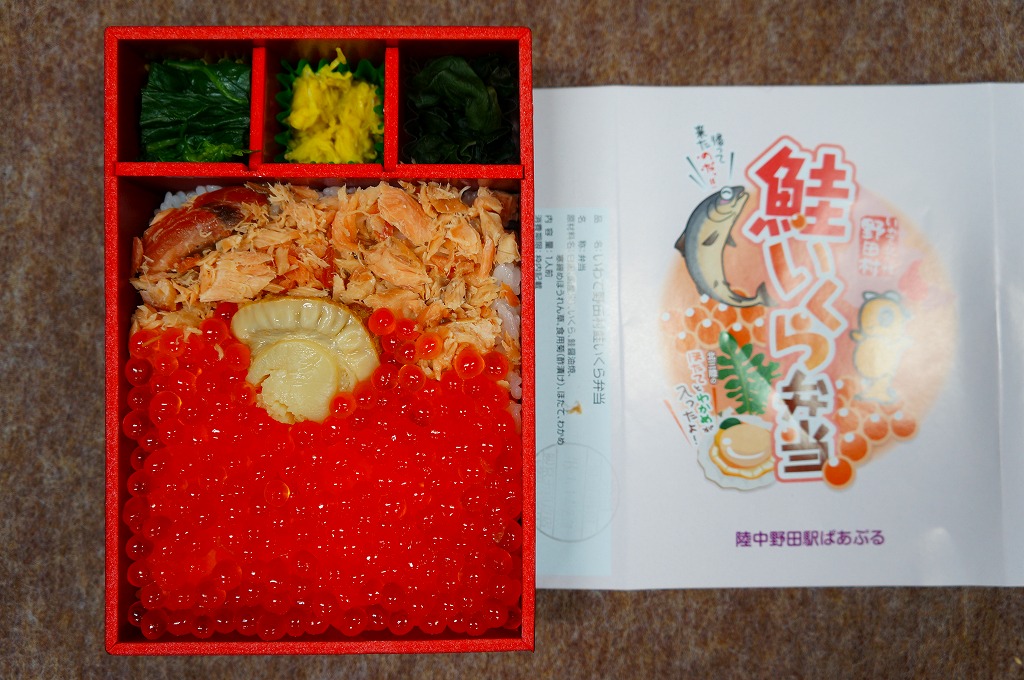 黒色の容器に、中身と駅弁の名前と野田村の位置でデザインした、鮭色の掛紙を巻く。中身は白御飯を、鮭の醤油焼きのフレークとイクラで覆い、ホタテの塩酒蒸煮をひとつ据え、シイタケ煮、塩ワカメ、食用菊の酢漬けを添えるもの。主役はきっと、三陸産のイクラ。しかしこの弁当の味の特徴はきっと、サケにある。フレークが大粒で、身の旨味がしっかり広がり、飯が進んだ。