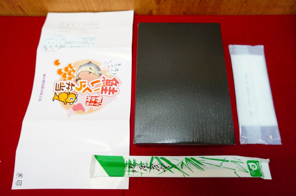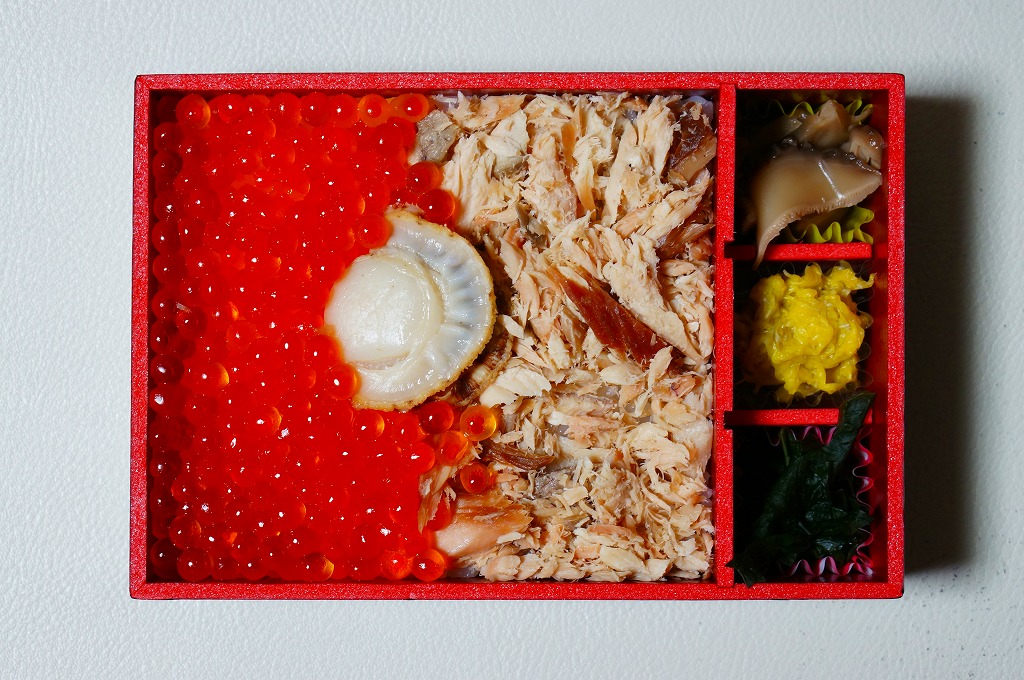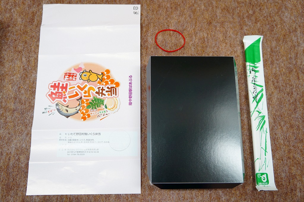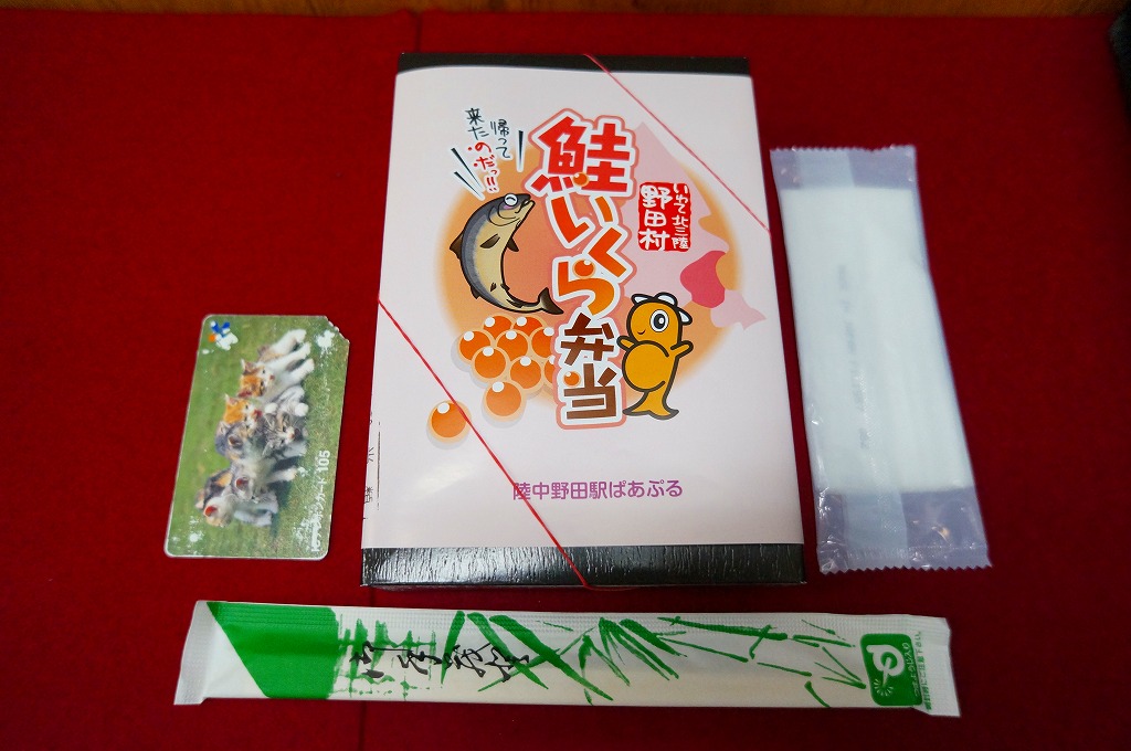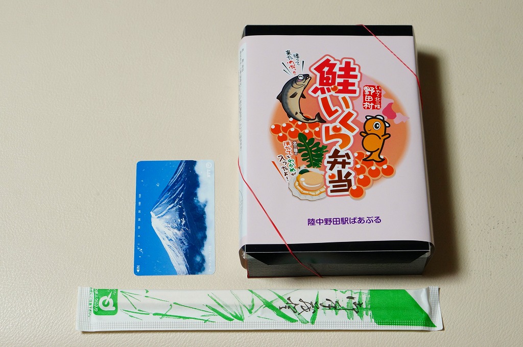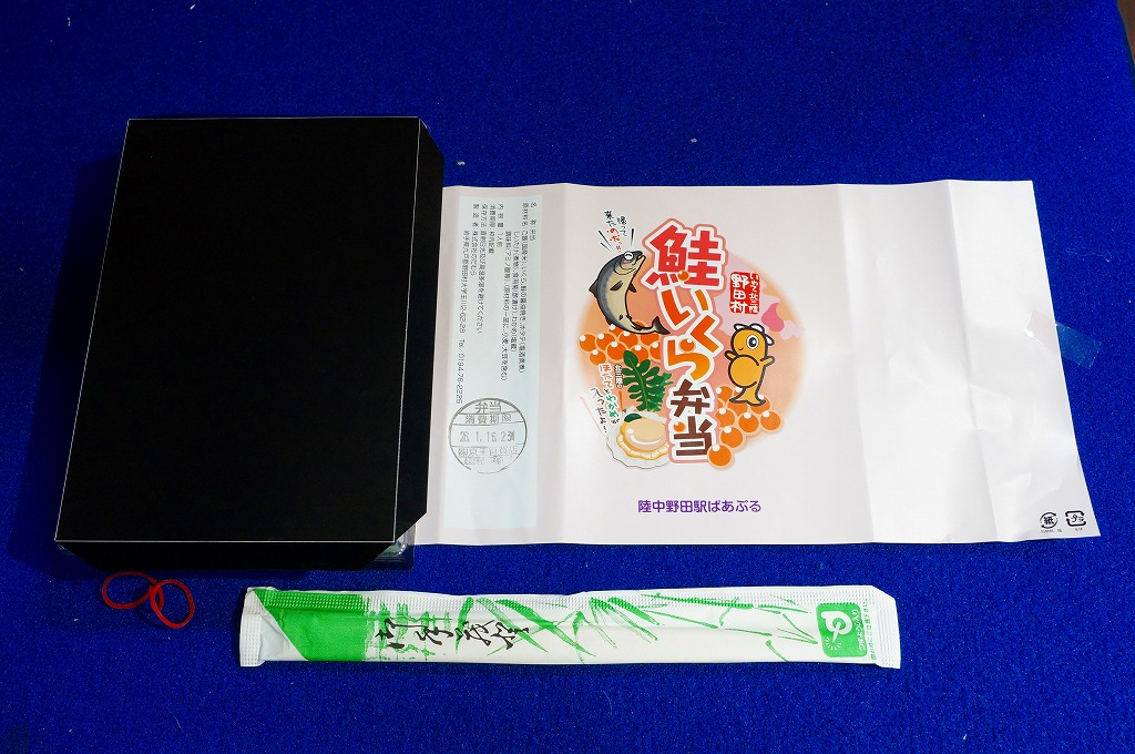 黒色の容器に、中身と駅弁の名前と野田村の位置でデザインした、鮭色の掛紙を巻く。中身は白御飯を、鮭の醤油焼きのフレークとイクラで覆い、ホタテの塩酒蒸煮をひとつ据え、シイタケ煮、塩ワカメ、食用菊の酢漬けを添えるもの。主役はきっと、三陸産のイクラ。しかしこの弁当の味の特徴はきっと、サケにある。フレークが大粒で、身の旨味がしっかり広がり、飯が進んだ。