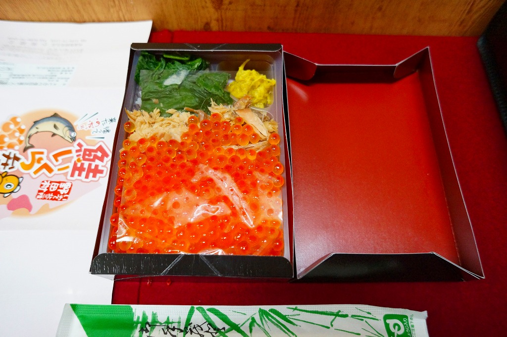 上記の駅弁「鮭いくら弁当」の、2014(平成26)年時点での姿。前年の付合せの寒締めほうれん草が、シイタケ煮に変わった。翌年のものより、イクラが多く、サケが少ない感じなのは、仕様の変更か、誤差の範囲か。引き続き、催事では1,200円で、現地では1,000円で販売。