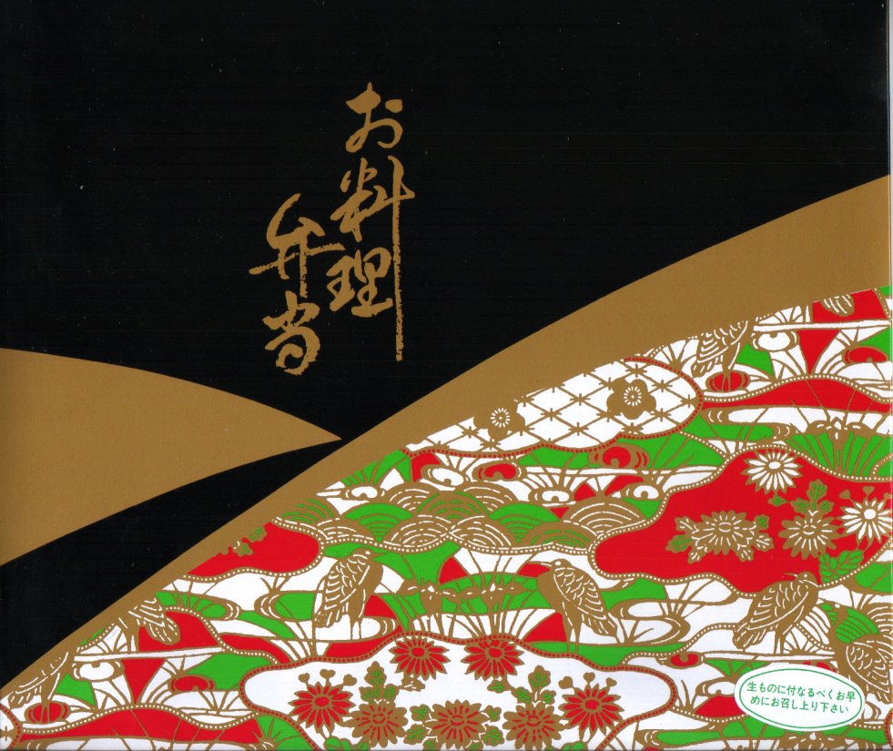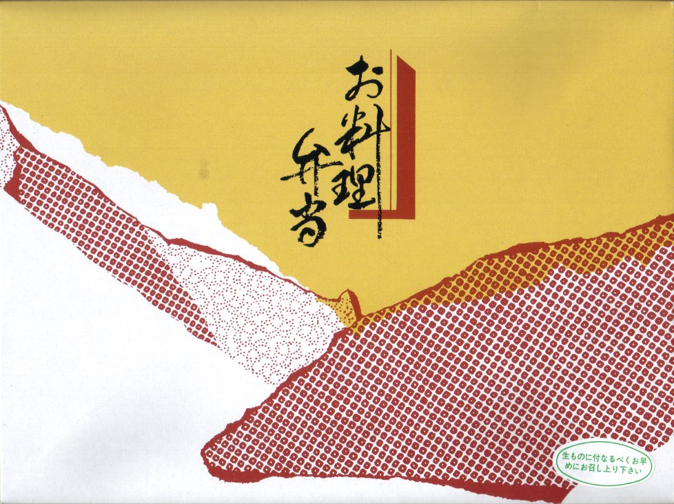 二段重ね容器を左右から包み込む構造の容器に、簡単な掛紙をかけて割りばしを挟んで、事務用の輪ゴムでしばる。中身は下段が鮭フレークの載る俵飯にイクラとフルーツとカステラ、上段は焼き魚にアワビ貝焼に春巻と茄子に椎茸や出汁巻卵など。価格は高いが素材の良さが感じられ、来年は掛紙に工夫を加えて再登場してほしいお弁当。