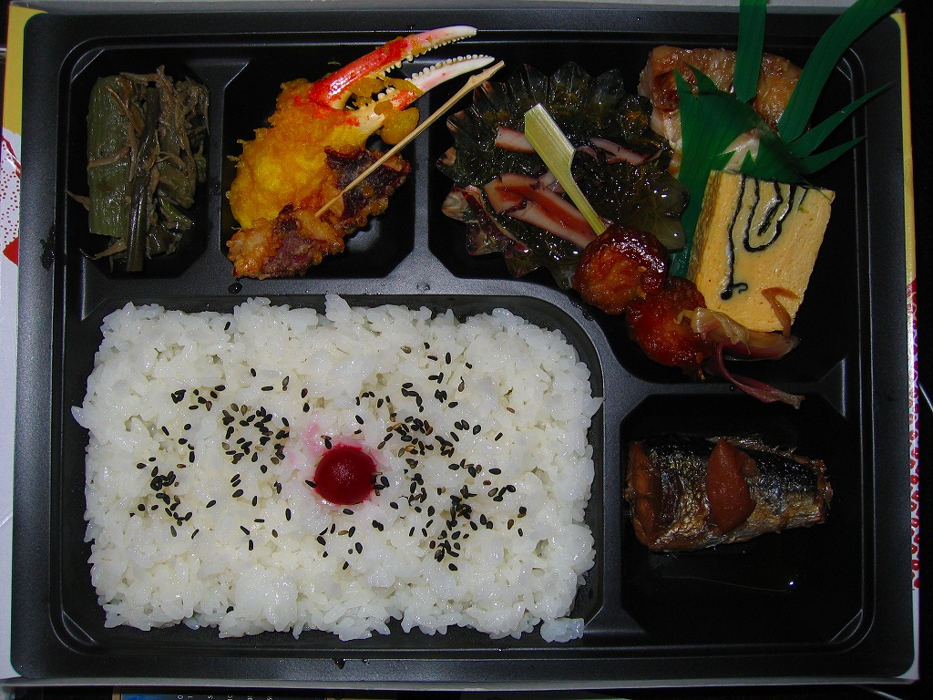 一部の駅弁屋でも使われる紙箱トレー入りの市販の惣菜弁当用容器を使用。中身は日の丸御飯にカニ爪カレー風味揚、串揚蛸足、海草二種に焼鮭と玉子焼といわし煮かどうか。いずれも小粒で中身の見栄えは劣り高額感はあるものの、無添加地場産な風味が感じられた。こちらも容器に駅弁や調製元に関する一切の情報がない。駅や車内にあった宣伝チラシでも挟んで、形だけでも特製弁当の演出があれば良かった。