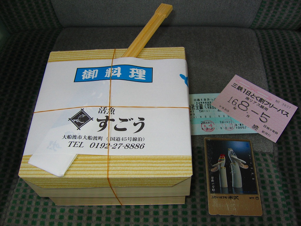 この弁当は、2002年から2004年までの販売か。2011年3月の東日本大震災による三陸鉄道とJR山田線の不通により、「リアス・シーライナー」の設定もなくなったため、この弁当ももう買えないと思う。