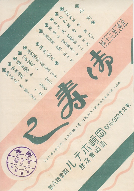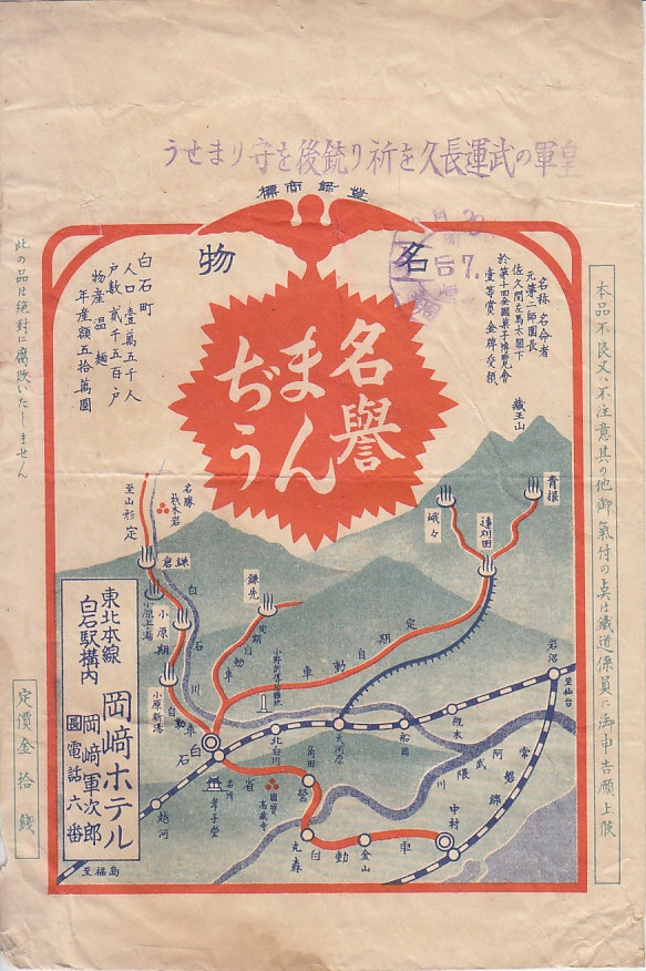 1940年代の調製と思われる、昔の白石駅弁の紙袋。弁当でなく、饅頭のもの。「皇軍の武運長久を祈り銃後を守りませう」と押印されるため、戦時のものだと思うが、路線図には1937年に廃止された大河原駅から遠刈田温泉までの仙南温泉軌道が描かれており、その前のものかもしれない。白石駅の名誉まんじゅうは、1906年の帝国陸軍第2師団の将兵凱旋を記念し発売したといい、名物としておそらく1940年代まで販売された。