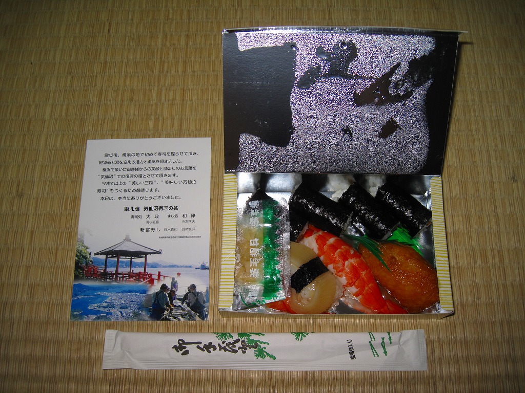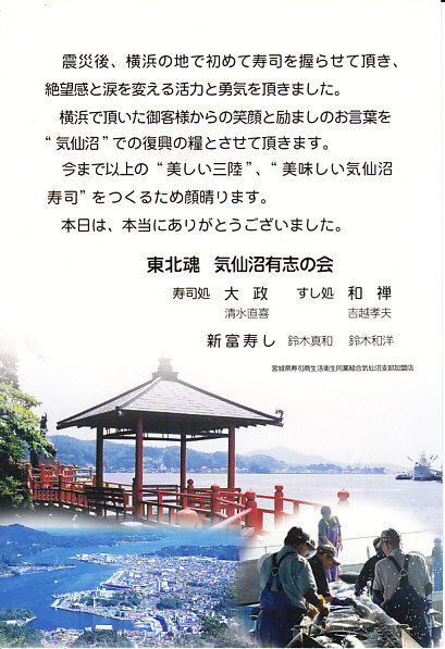 調製元の「大政」「新富」「和禅」は、宮城県気仙沼市内の握り寿司食堂。2011年3月11日の東日本大震災による地震と津波で店舗が全壊、その後はなんと4人で「流され寿司気仙沼握り屋衆」というグループを組み、この横浜市内を皮切りに各地のイベントで寿司を握ったという。