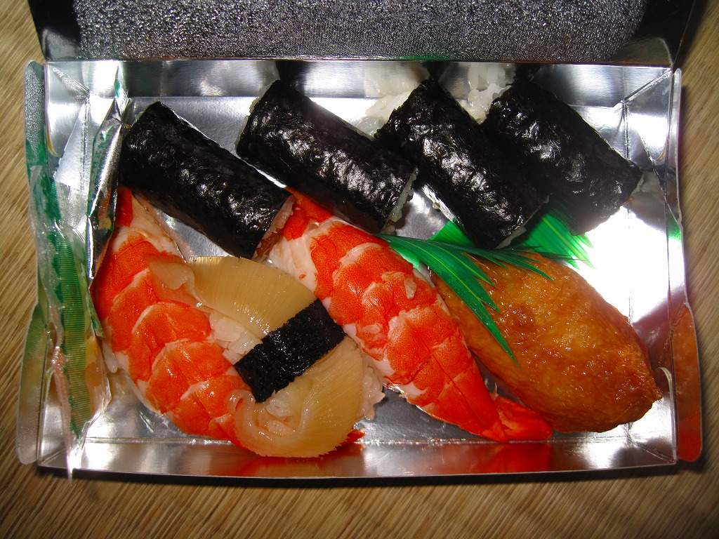 これは駅弁でなく、2011(平成23)年6月4・5日に横浜市内の日本大通で開催されたイベント「2011tvk秋じゃないけど収穫祭」で、テント売りされたお惣菜。握り寿司にぴったりな紙製惣菜容器に、細巻き4本、いなりずし、エビの握り2個、ふかひれの握り1個を詰めていた。人の手と新鮮さを感じる締まりの良さが心地良かった。購入価格は500円だが、閉店前の割り引きかもしれない。