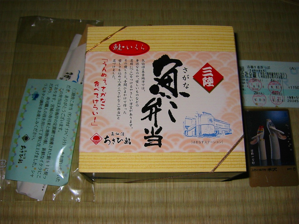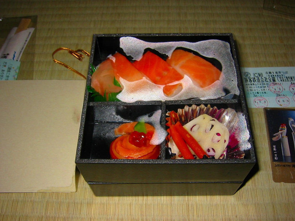 2004(平成16)年1月の京王百貨店の駅弁大会で実演販売。ローカル線の無人駅の駅弁を名乗り、この催事の目玉商品の扱いで、突然に出現した。正方形の容器を二段重ねで使用し、掛紙代わりに木目調のボール紙でふたをして金色のゴムひもでしばる。中身は下段が鮭はらこめし、上段がスモークサーモンの寿司と巻き物など。数名のスタッフで一日何百個も実演販売できるくらいだから、ふた記載の「手間ひまかけて作った」には同意できないが、目でも舌でも、下段に素朴な暖かさ、上段に和風な高級感を感じ取れる、良い内容。
