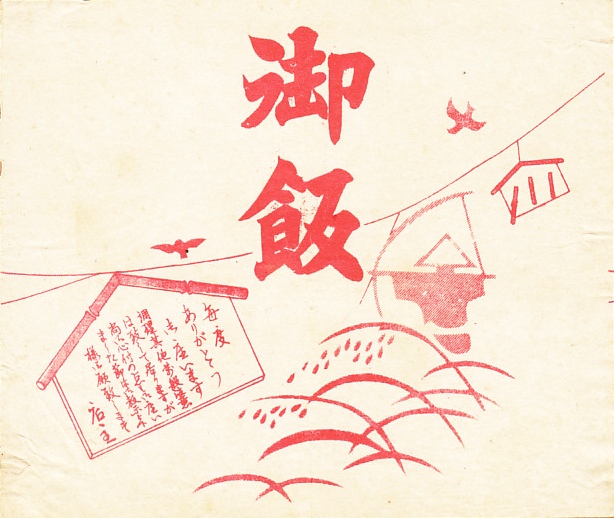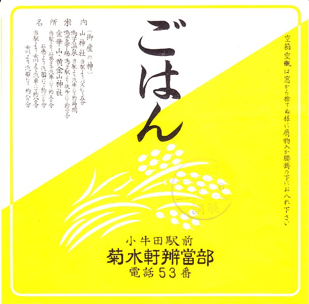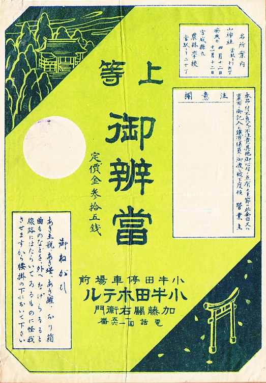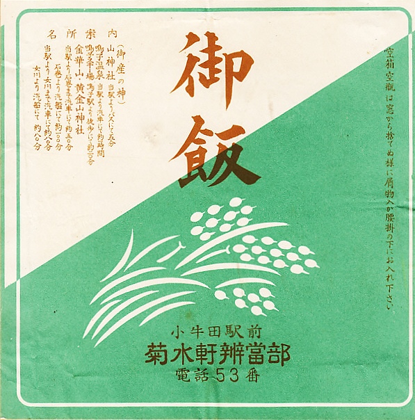 おそらく1920年代、大正10年頃のものと思われる、昔の小牛田駅弁の掛紙。おかずの掛紙では名所案内として、山神社とその祭典日に宮城県立農林学校を掲載する。御飯の掛紙は稲作を描くが、これはこの地域にかなうもの。