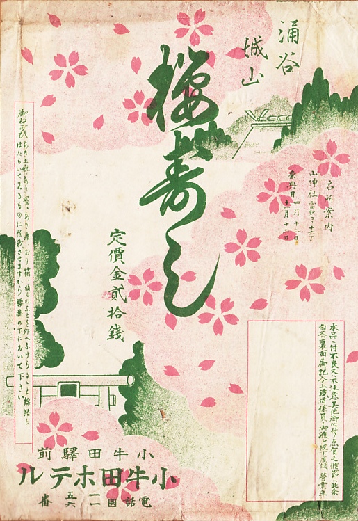 おそらく1920年代、大正10年頃のものと思われる、昔の小牛田駅弁の掛紙。涌谷城山の桜を描いたのだろうか。小牛田駅の東方約6kmにある、涌谷町の城山公園は、今も桜の名所である。