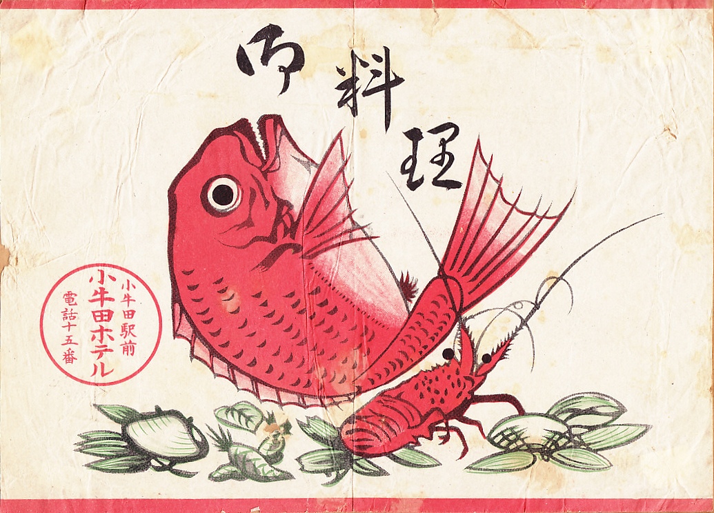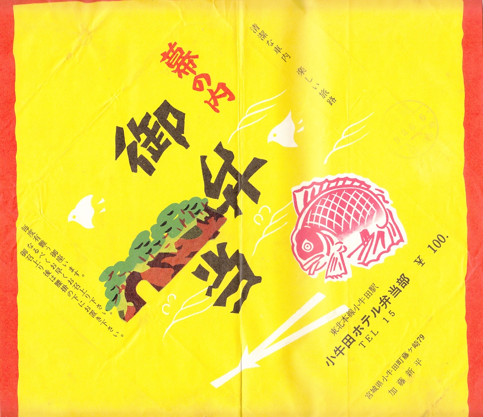 第二次大戦前のものかと思われる、昔の小牛田駅弁の掛紙。収集者は1929(昭和4)年6月28日の調製だとする。小牛田ホテルは小牛田駅の駅弁屋であるが、掛紙に駅弁として必要な記載内容が一切ないため、これは仕出し弁当など駅で売らない弁当の掛紙だろう。タイやエビが華やかな、大きな掛紙。
