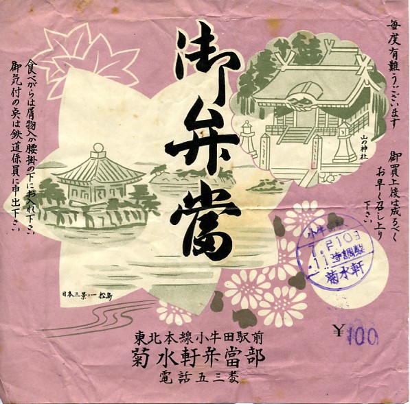 1950年代の7月10日11時の調製と思われる、昔の小牛田駅弁の掛紙。小牛田駅から2kmほどの山の神社と、小牛田からは距離のある東北三景松島を描く。平成時代にも2社が競った小牛田の駅弁は、21世紀に残らなかった。