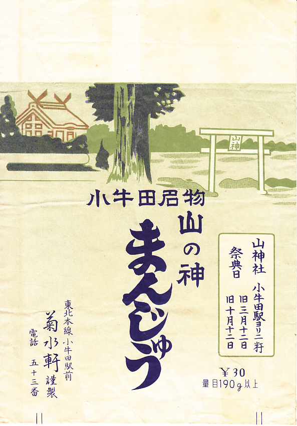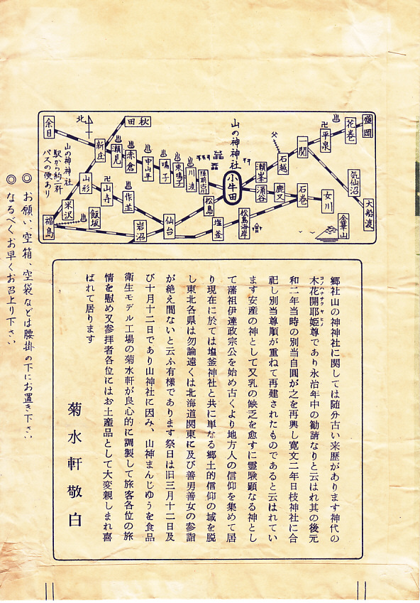 昭和30年代、1960年前後のものと思われる、昔の小牛田まんじゅうの紙袋。表側に神社と商品名を描いて山神社の祭典日を記し、裏面に路線図と説明文を記す構成は、現在の村上屋のものと変わらない。当時は複数の調製元が、小牛田まんじゅう、山の神まんじゅうを販売していたという。
