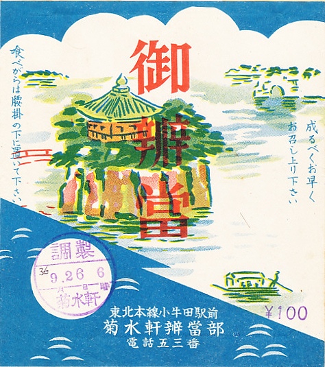 1960年代、昭和35年前後の、9月26日6時の調製と思われる、昔の小牛田駅弁の掛紙。収集者は1961(昭和36)年のものと判断し、掛紙に数字を書き入れた。おかずの掛紙には松島と五大堂を描き、御飯の掛紙には稲穂を描いた。