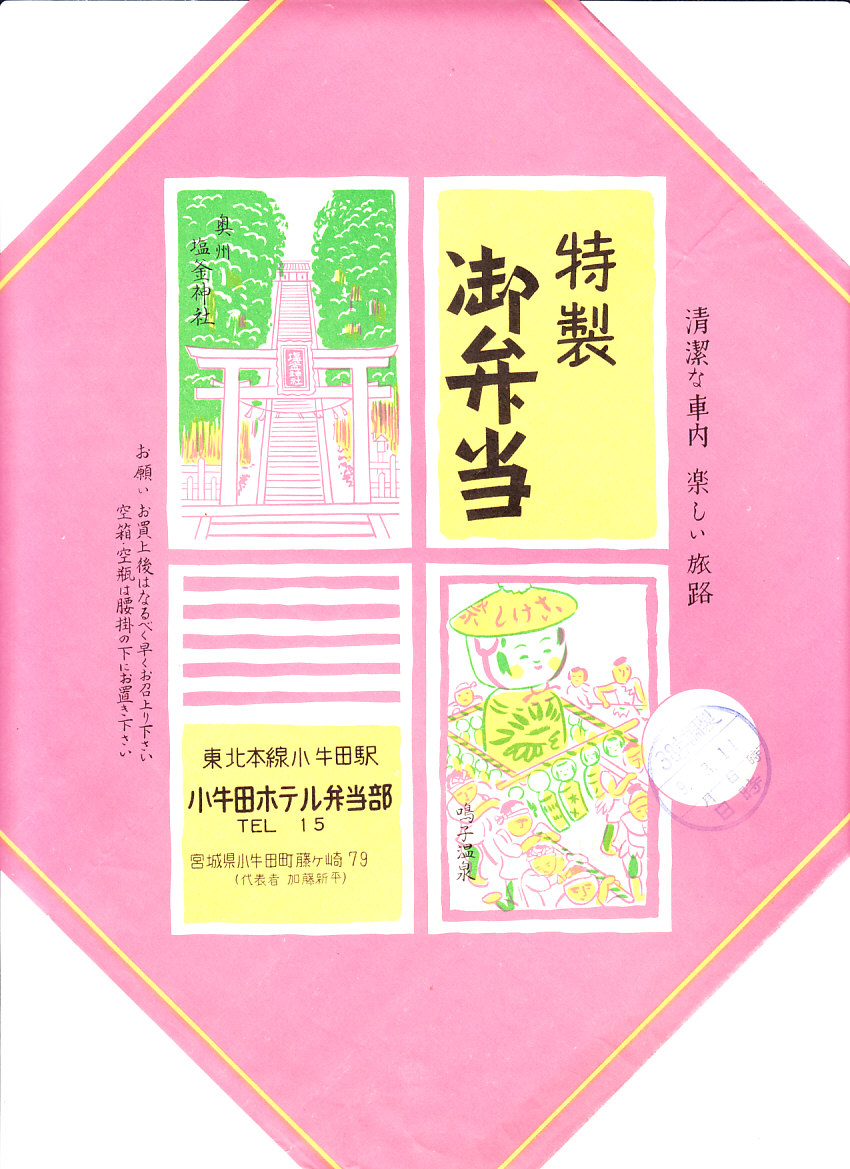 1963(昭和38)年9月3日(火)11時の調製と思われる、昔の小牛田駅弁の掛紙。奥州塩釜神社と鳴子温泉という、小牛田から離れた名所を描いた。