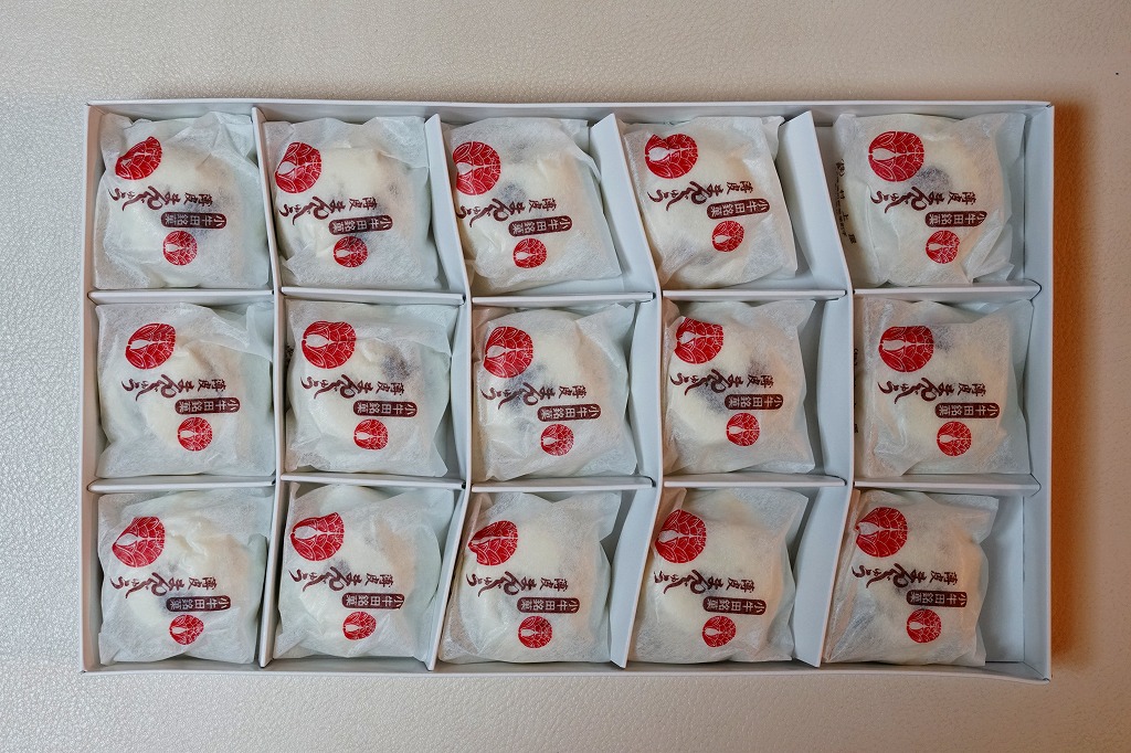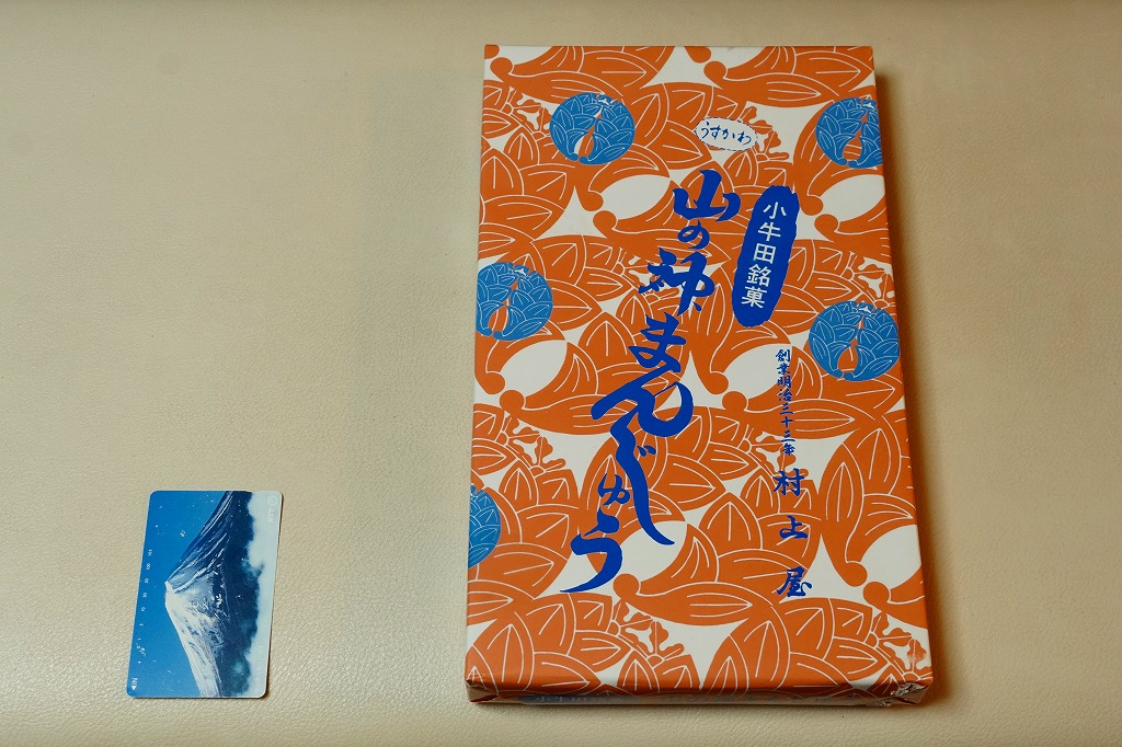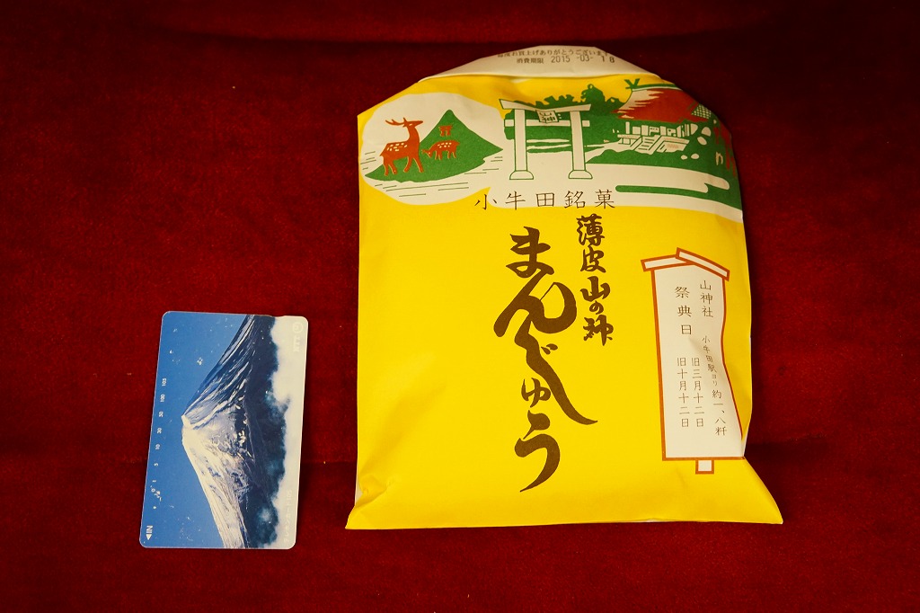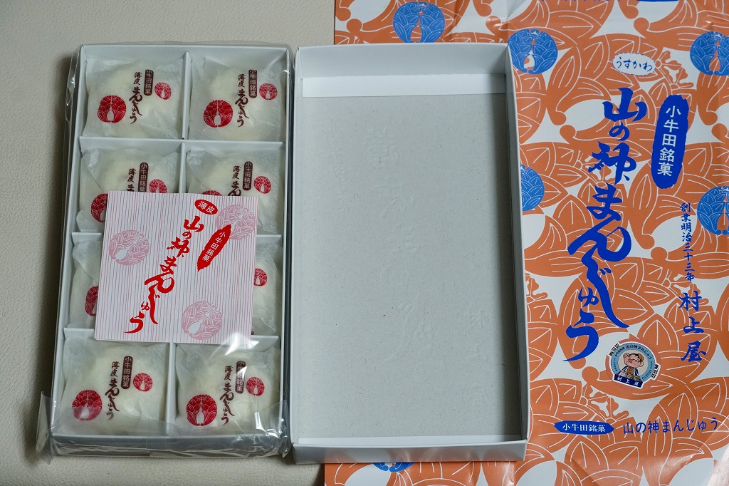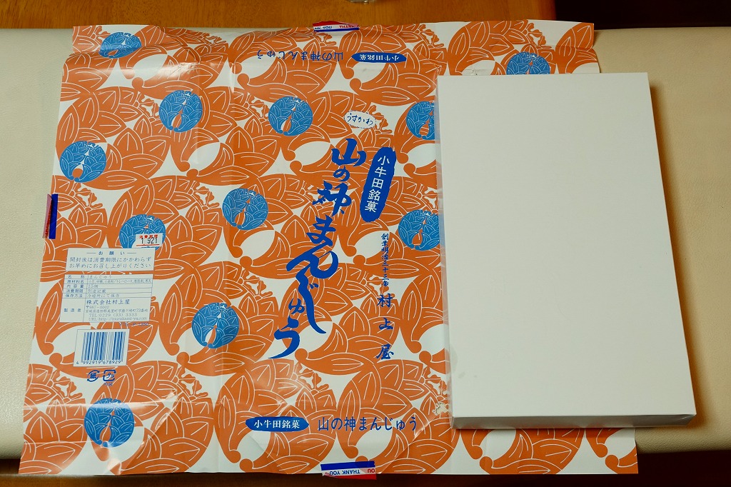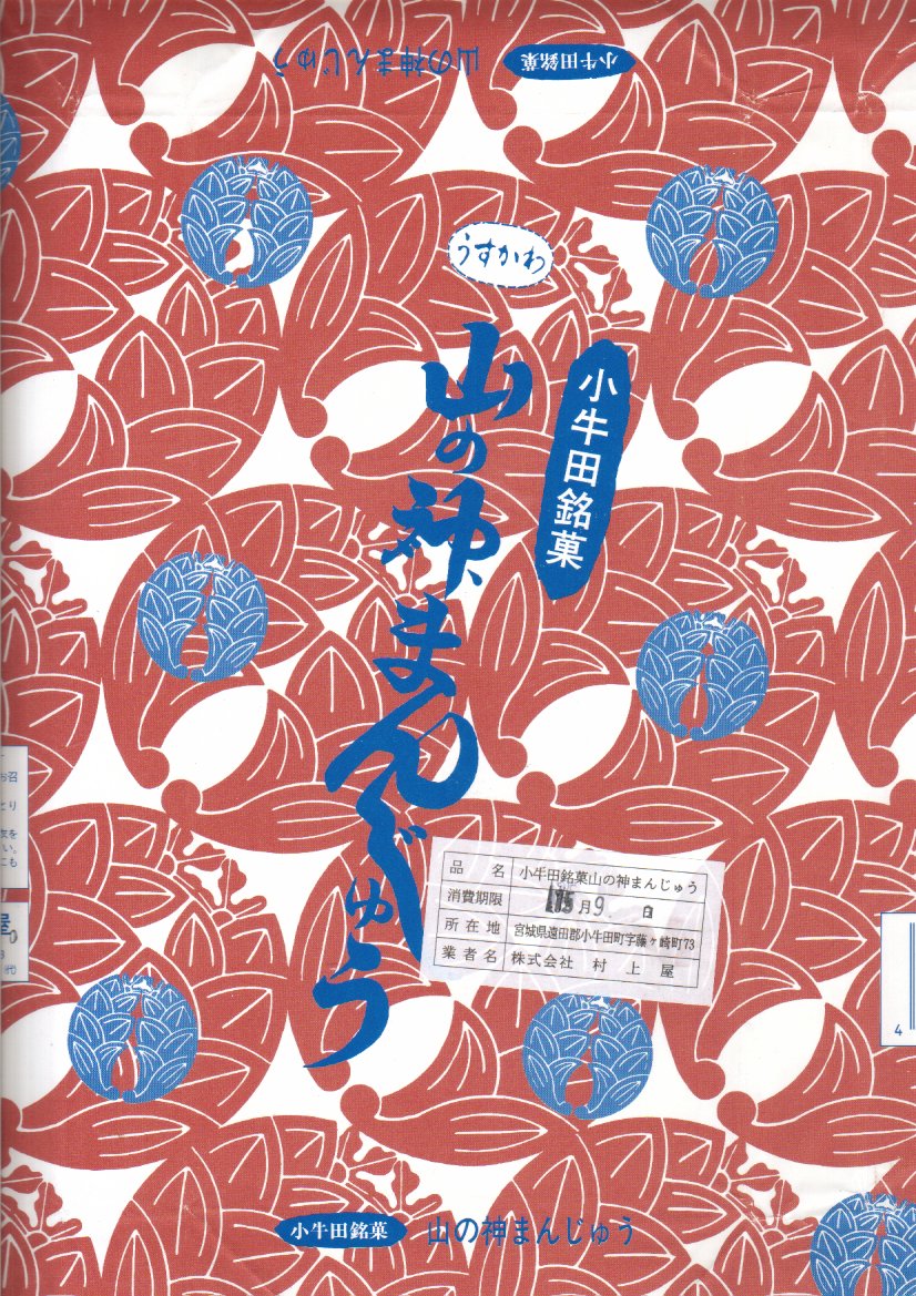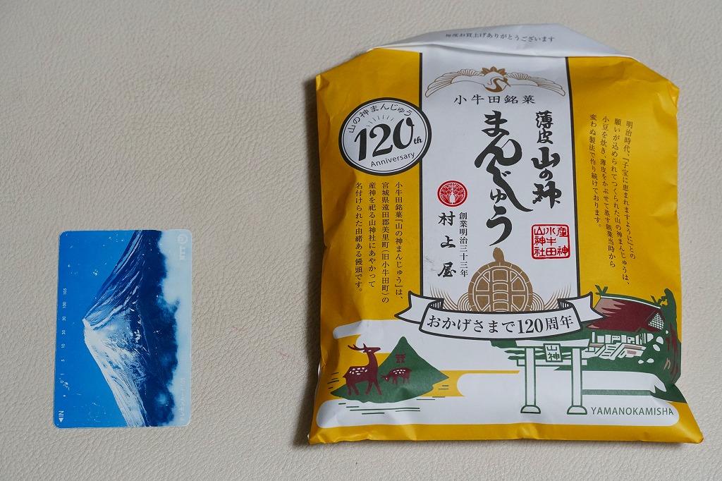 駅売り名物の小牛田饅頭、正式名称「山の神まんじゅう」の、15個入りのもの。包装紙の絵柄や、白いボール紙でできた紙箱のつくりは、8個入りのものと変わらない。観光地ではなく、遠方からの列車が消えたため旅行者が訪れることがなくなった駅で、日持ちがそれほどするわけではない商品がちゃんと個数別に3種類売られていたことで、これが地元で親しまれていることを感じる。8個入りと15個入りは、通信販売でも買える。