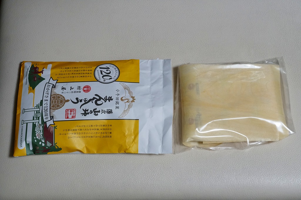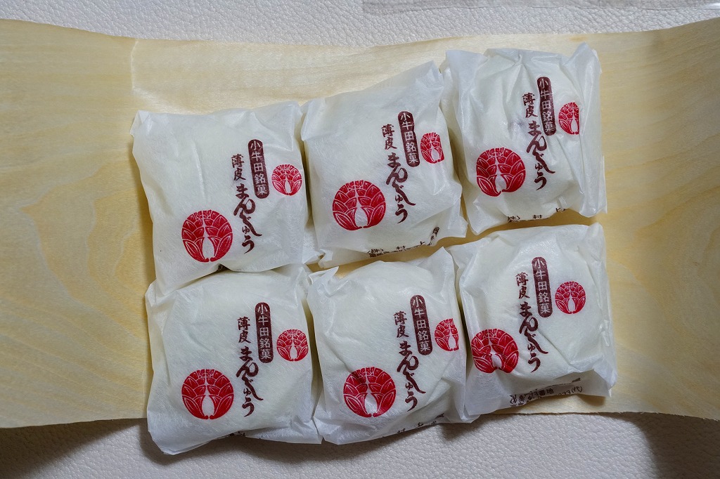 小牛田まんじゅうの6個入り。過去にもあったかもしれないが、これは2020(令和2)年の発売か。上記の5個入りと同じように、個包装された小牛田まんじゅう、山の神まんじゅう、小牛田銘菓薄皮まんじゅう、つぶあんを白い生地で包んだ小さな饅頭を6個、経木で包み、透明な袋に密封し、紙袋に詰める。内容量は5個入りの2割増しなのに、価格は4割増しの、不思議な設定。今回の紙袋は山の神まんじゅうの120周年を祝っていた。価格は2021年時点で627円、2023年時点で670円、2024年時点で720円。