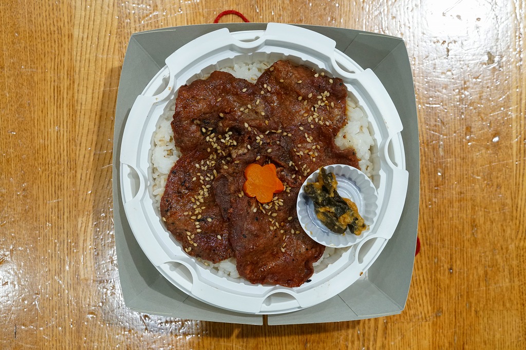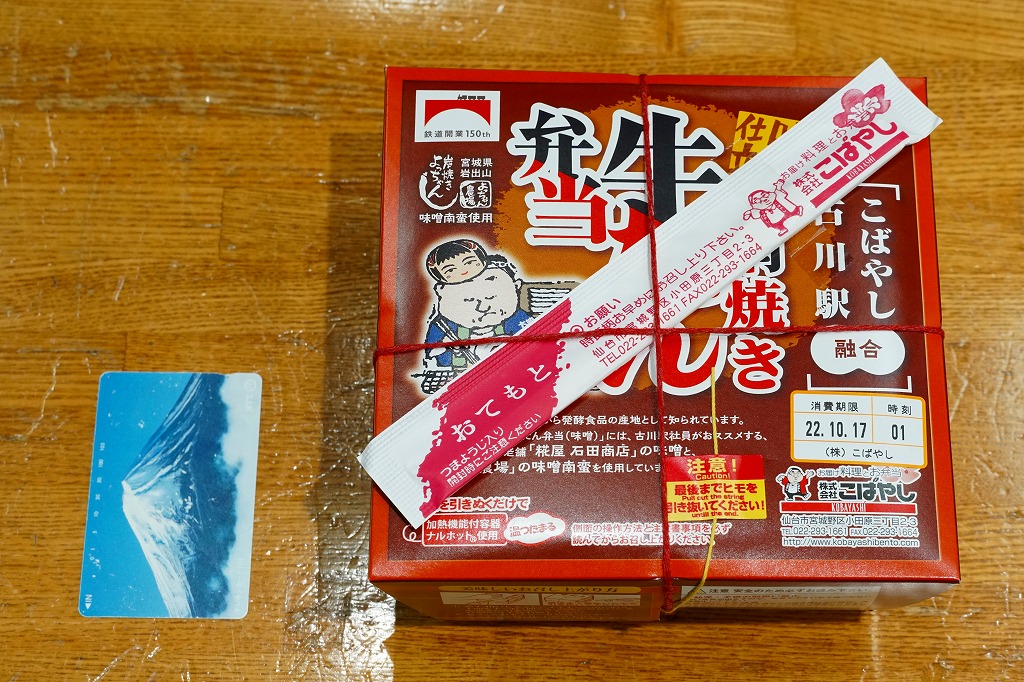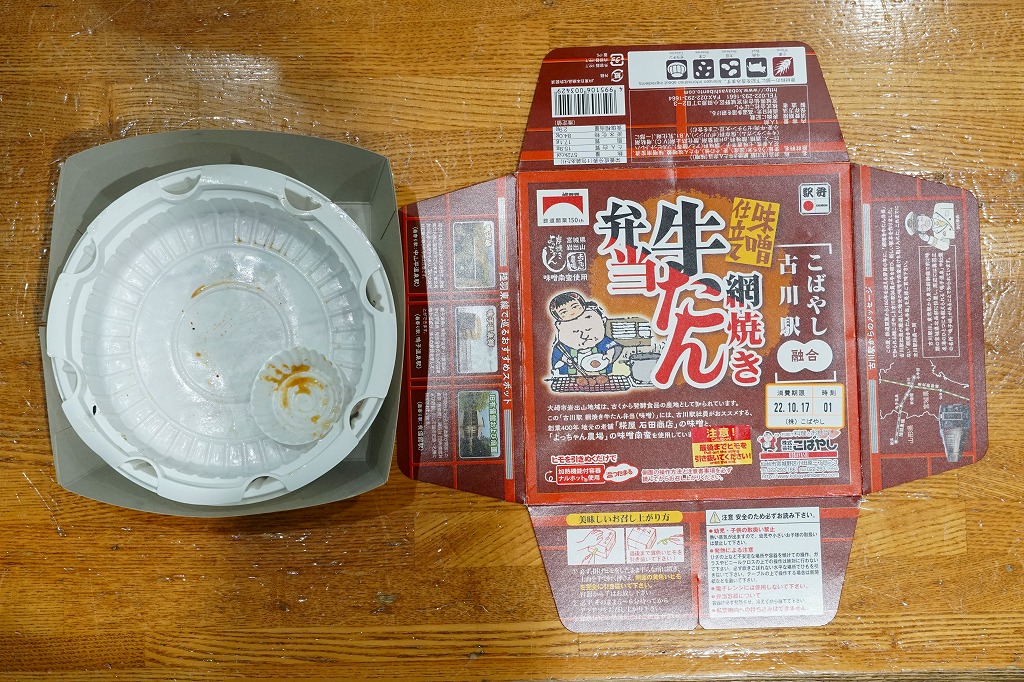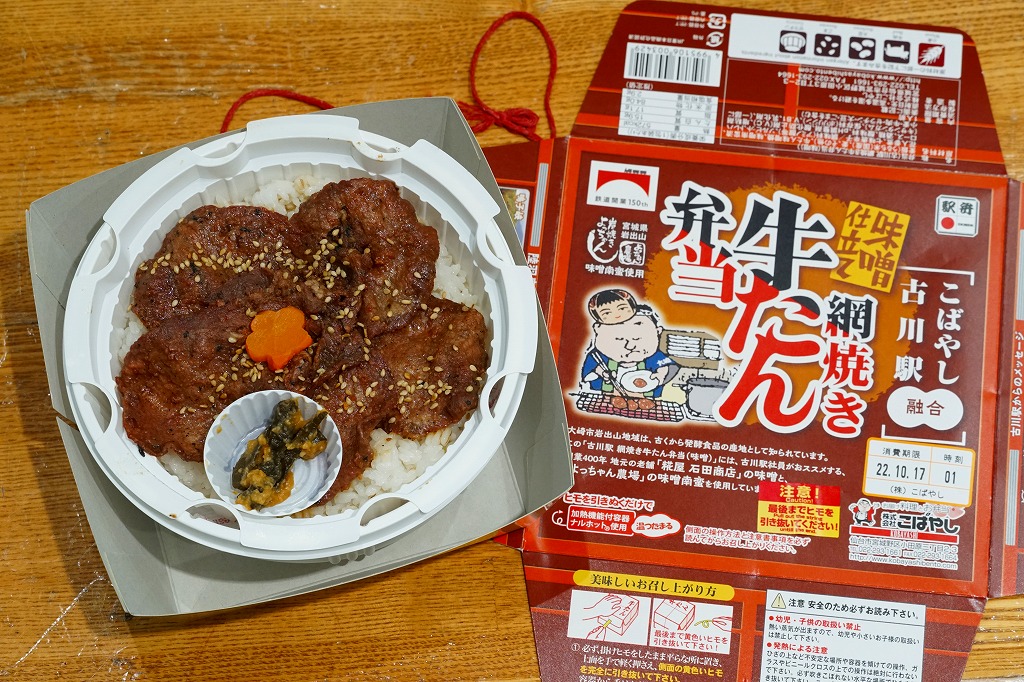 基本的には、仙台駅で人気の駅弁「網焼き牛たん弁当」と同じ。調製元も同じ。商品名などを賑やかに記した紙箱に収めた、丸い加熱機能付き容器に、麦混じりの白飯を詰め、牛たんの味噌焼きを貼り、花人参を据え、味噌南蛮漬を添える。味も仙台駅弁。古川駅がある宮城県大崎市の味噌と味噌南蛮を使ったそうな。2023年で終売か。