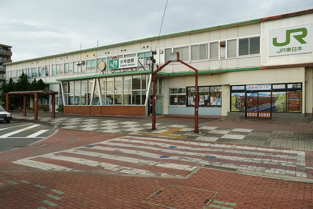仙台駅から東北本線の普通列車で約45分。小牛田駅がある宮城県遠田郡美里町(みさとまち)は、2006(平成18)年1月に小牛田町と南郷町が合併してできた、人口約2万人の町。東北本線が陸羽東線と石巻線を分ける駅は、東北新幹線が開通する前は鉄道の要衝であり、明治時代から駅弁が売られ、大正時代から機関区が置かれた。今は駅に駅弁も売店もないが、かつて駅売り名物として知られた饅頭が、かつての駅舎を転用した観光案内所で売られる。1890(明治23)年4月16日開業、宮城県遠田郡美里町字藤ケ崎町。