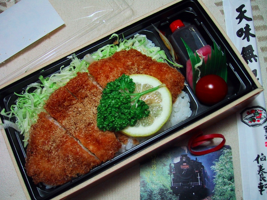 容器に透明なふたをかけた簡素な容器で、掛紙はなくシール貼り。白御飯の上に千切りキャベツとトンカツを載せて、スライスレモンとパセリにミニトマトが入る、内容は一般的なトンカツ弁当そのもの。味は美味い宮城米にやわらかいトンカツと、仙台駅弁は期待を裏切らない。現存しないものと思われる。