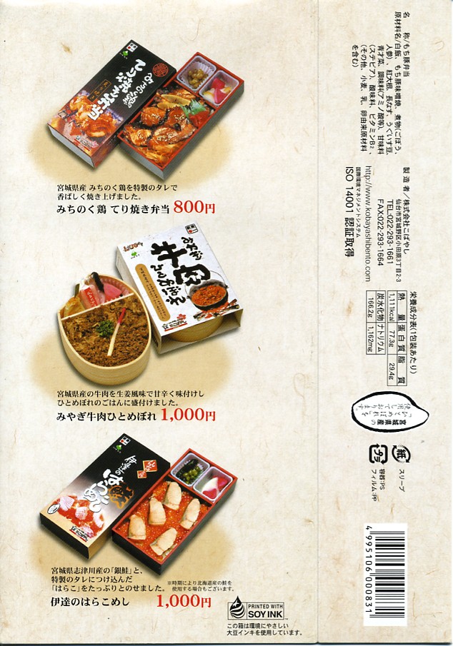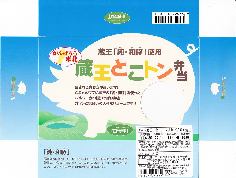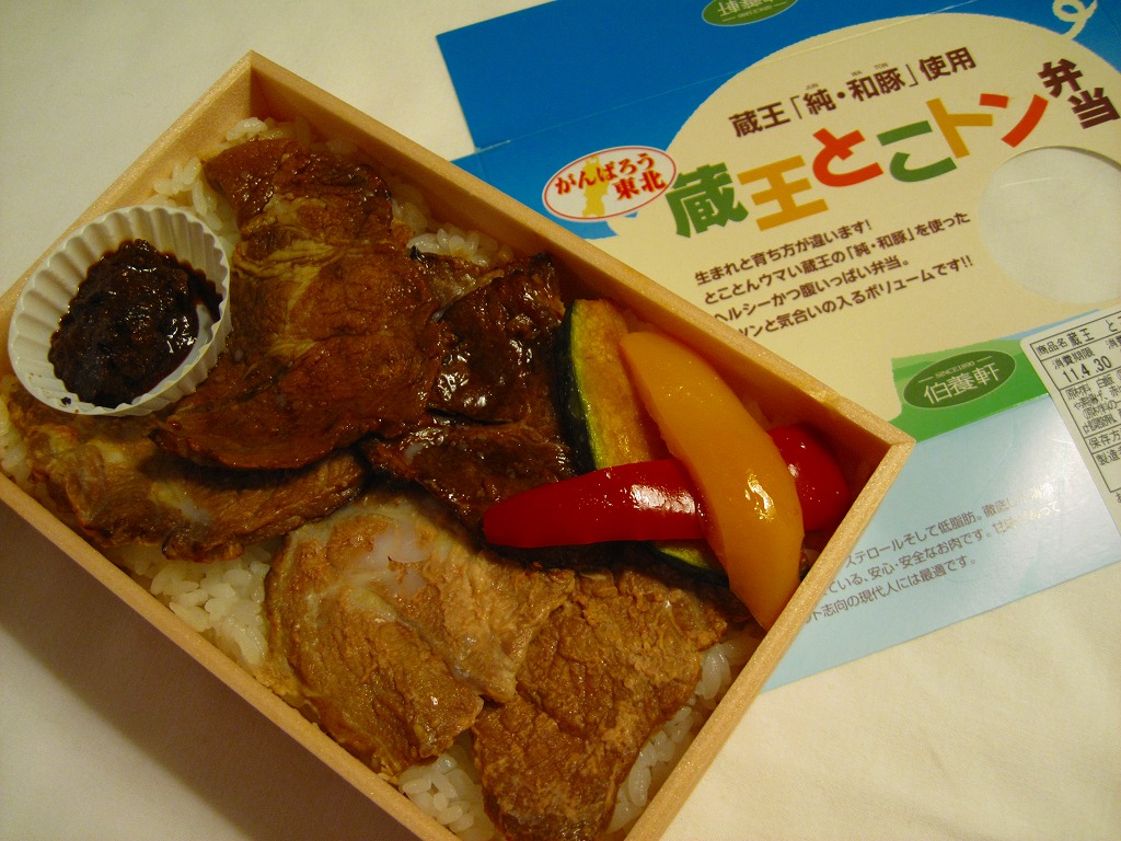 2008(平成20)年に発売か。小柄な長方形の容器に透明なふたをして、豚と蔵王と宣伝文をデザインしたボール紙のふたをする。中身は白御飯の上に豚肉の味噌焼と生姜焼を貼り付け、カボチャと2色のピーマンを付け、ひしほ味噌を添えるもの。見た目に脂が浮いて少し臭う豚肉も、御飯と合わせて食べれば、しっとりしていていい感じ。「純・和豚(じゅん・わとん)」とは、宮城県刈田郡蔵王町の丸山グループが生産し主に仙台へ出荷される銘柄豚で、低カロリー・低コレステロール・高タンパク質を実現したヘルシーな豚肉なのだそうな。2011年までの販売か。