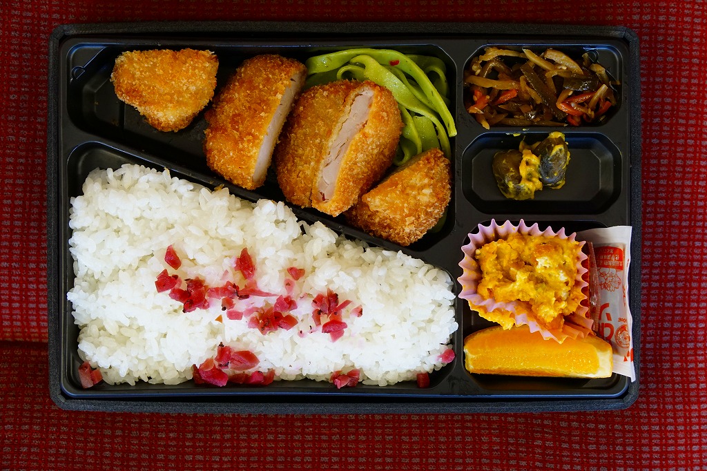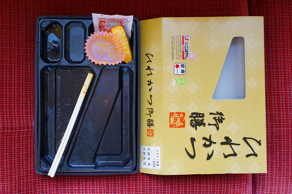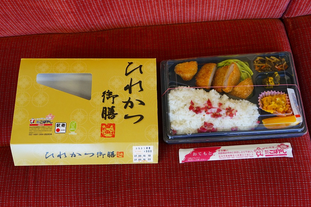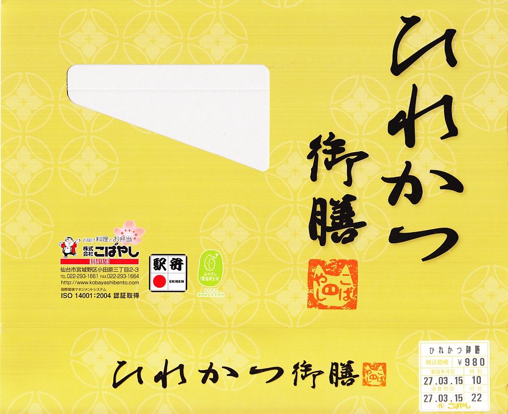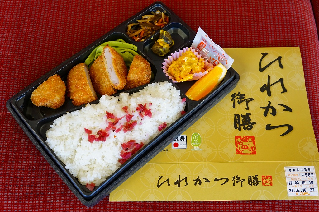 2015(平成27)年に限り販売か。商品名のとおりのヒレカツ弁当で、刻み梅をまぶした白御飯、5切れにカットされたひれかつ、ほうれん草パスタ、かぼちゃサラダ、きんぴらごぼう、小茄子からし漬。特徴がないのが心地良い、駅弁らしさのないところが機能的な、常温で普通に上質なトンカツ弁当だった。