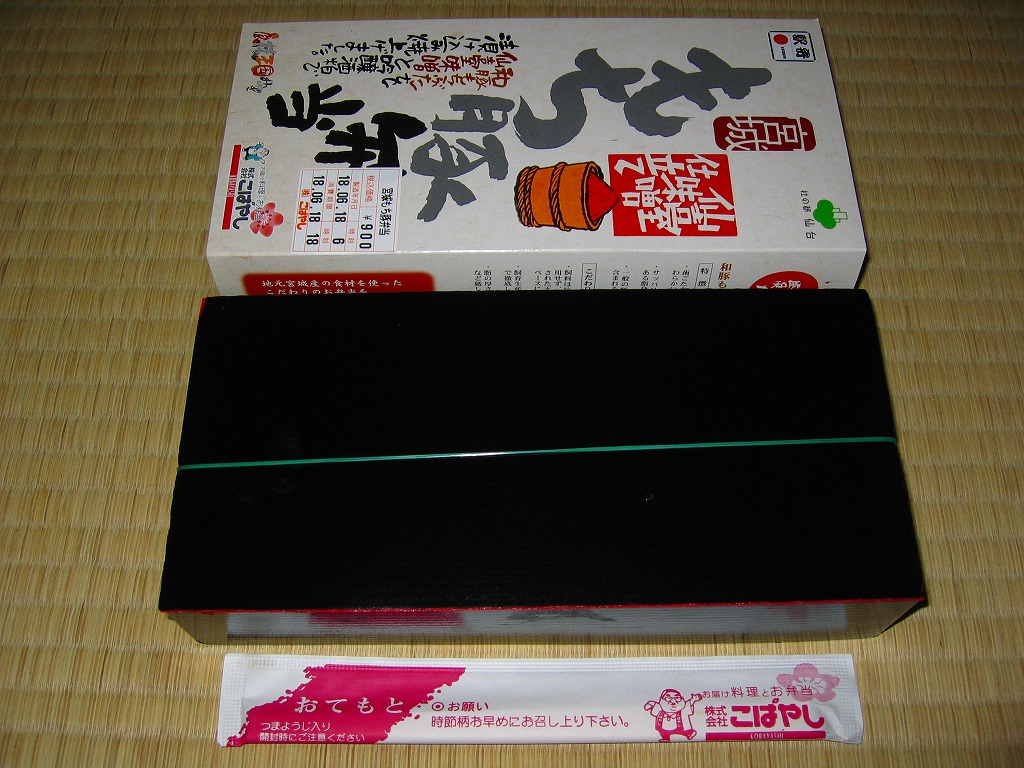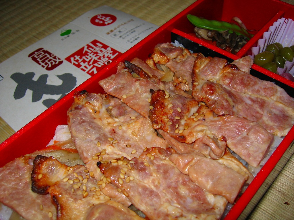 2006(平成18)年3月19日に発売。黒い長方形の容器に同色同素材のふたをしてゴムで留め、商品名と売り文句などを書いたホールが身の枠にはめる。中身は白御飯の上にささがきごぼうを敷いて、仙台味噌と吟醸酒粕で漬けて焼いた宮城県産「和豚もち豚」をベタベタと貼り、ニンジンと絹さやと舞茸を添え、うぐいす豆と長なす漬と紅大根甘酢漬を付ける。