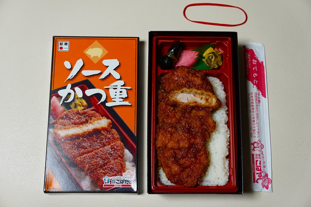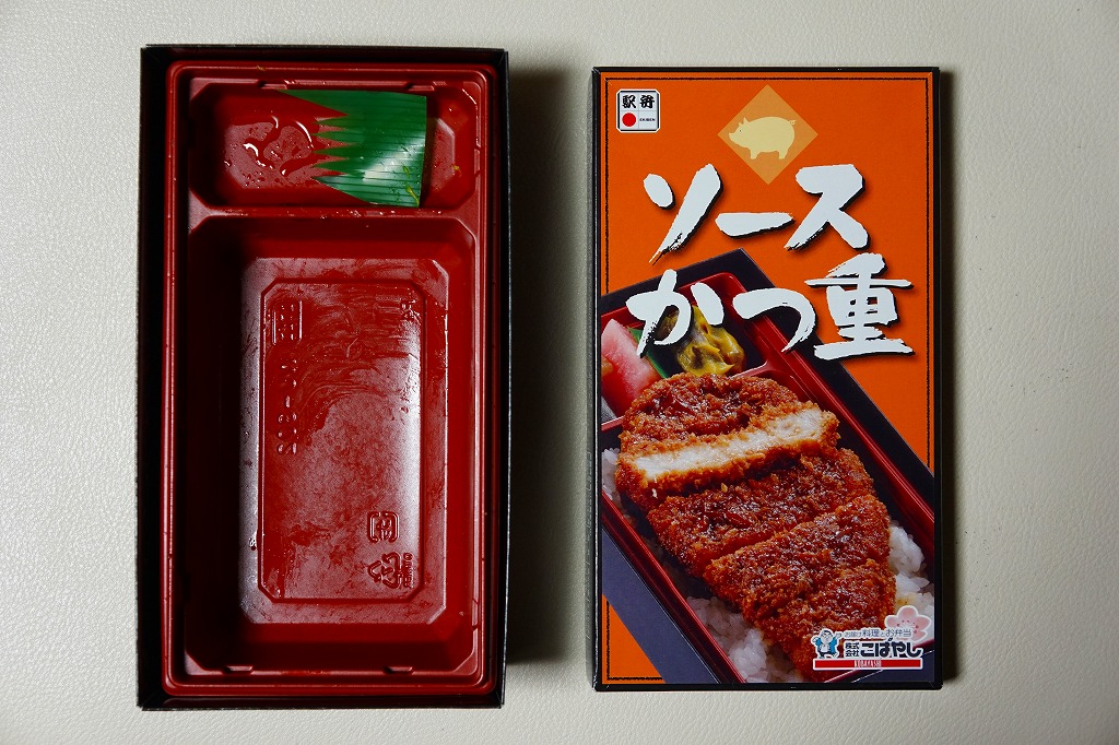 2014(平成26)年の発売。10年ほど前に同じ名前と中身で同じ調製元が同じ駅で売っていた駅弁の再登場。中身はふたの写真のとおり、白御飯の上にソース漬けのトンカツを5切れに刻んで1枚置き、ニシン昆布巻、紅大根、ナスからし漬を添えるもの。メインのカツは衣が厚めで肉が薄めも、辛さや臭みがなく、食べやすいという意味で印象に残りにくいカツ丼。とても実用的な駅弁。2018年までの販売か。