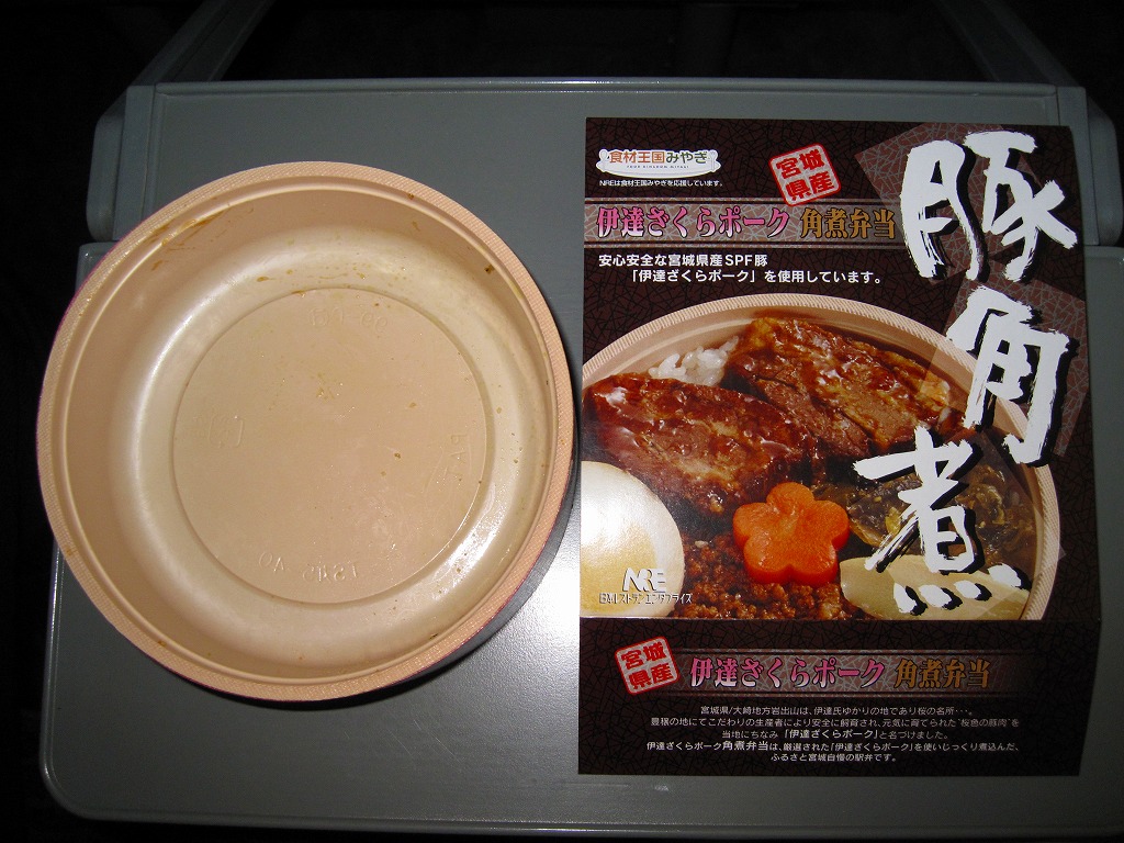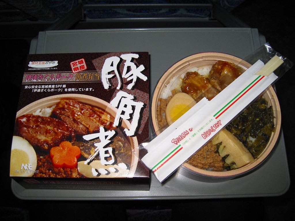角煮弁当を名乗るのに角煮が2個しか入っていないという感想はあるが、冷めてもうまく、見た目どおりの味で、分量もほどほどで、価格も控えめという、地味だけどハズレのない安心感のある駅弁。伊達ざくらポークについてはパッケージに宣伝文が書かれるが、実際には宮城県産のSPF(Specific Pathogen Free)豚(=特定の5つの疾患を持たない豚)のうち、宮城県大崎市古川の古川ミートの商品である模様。