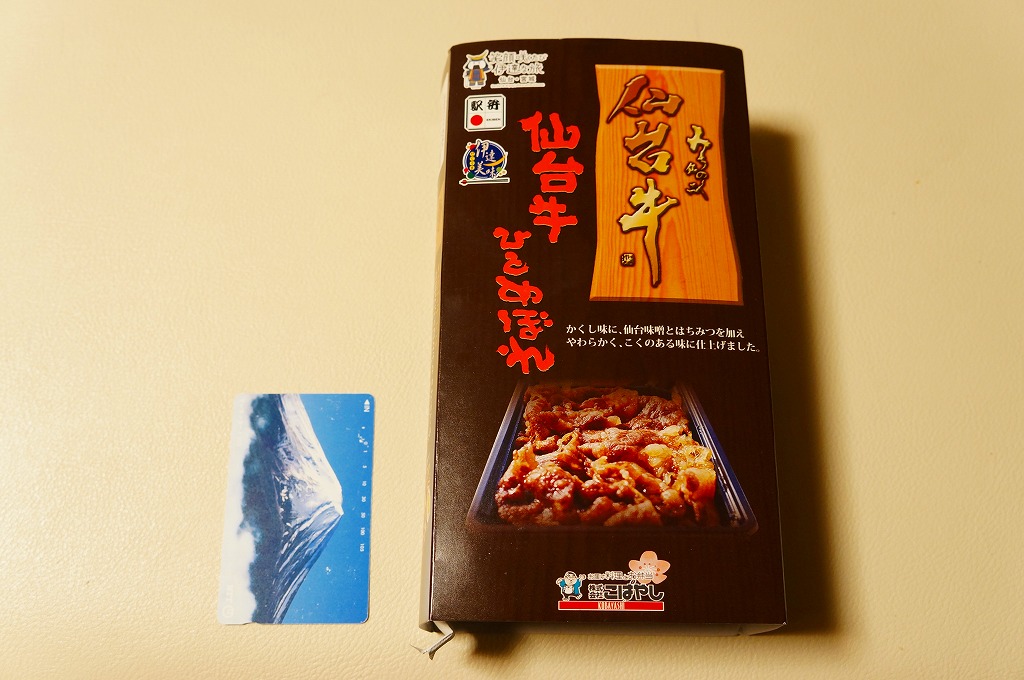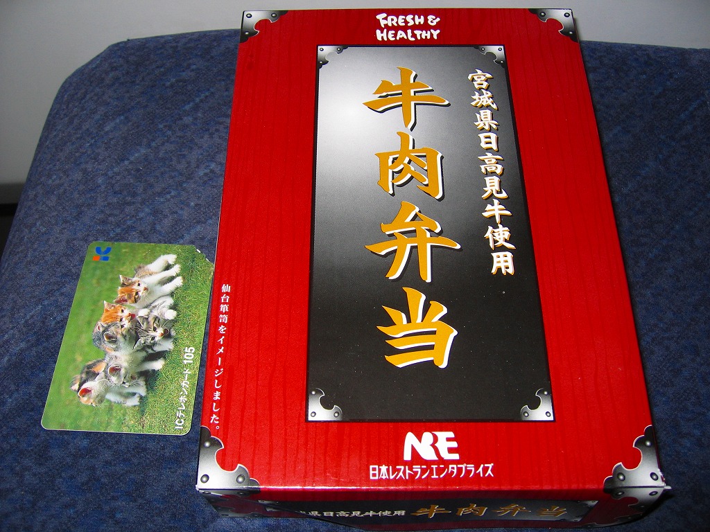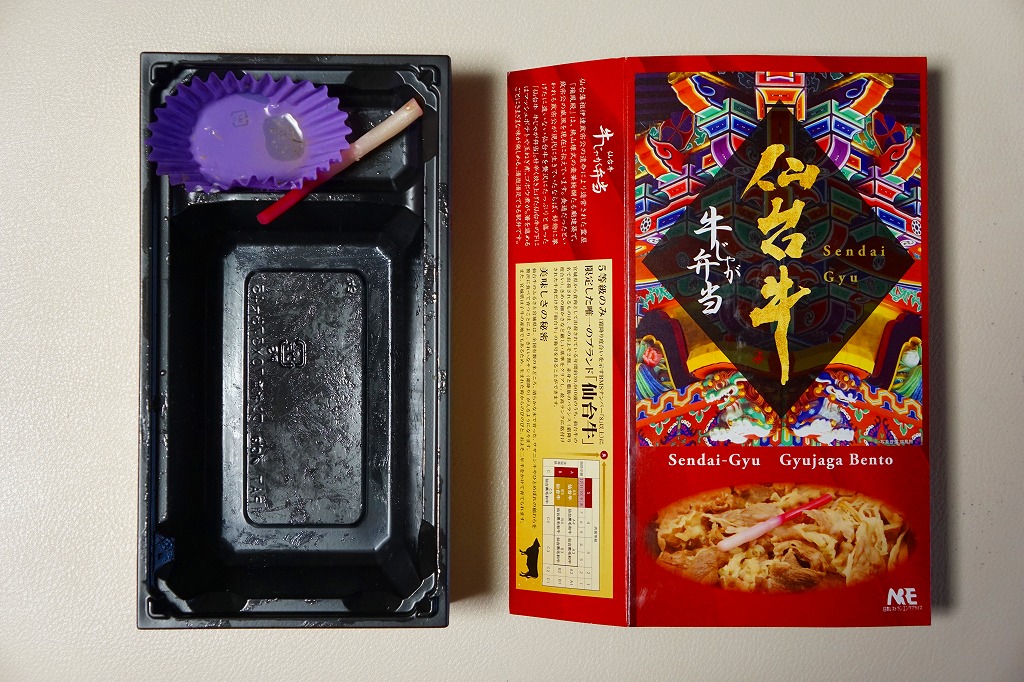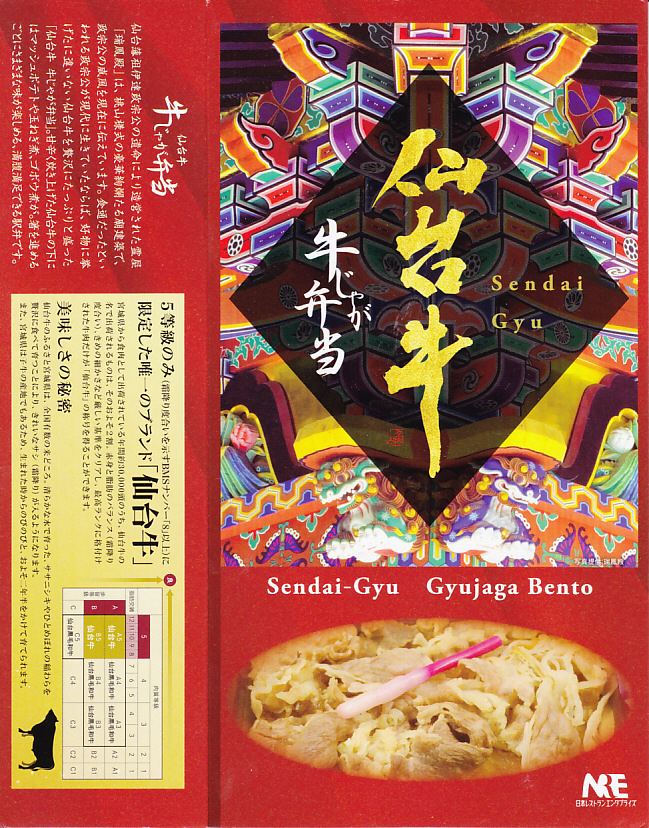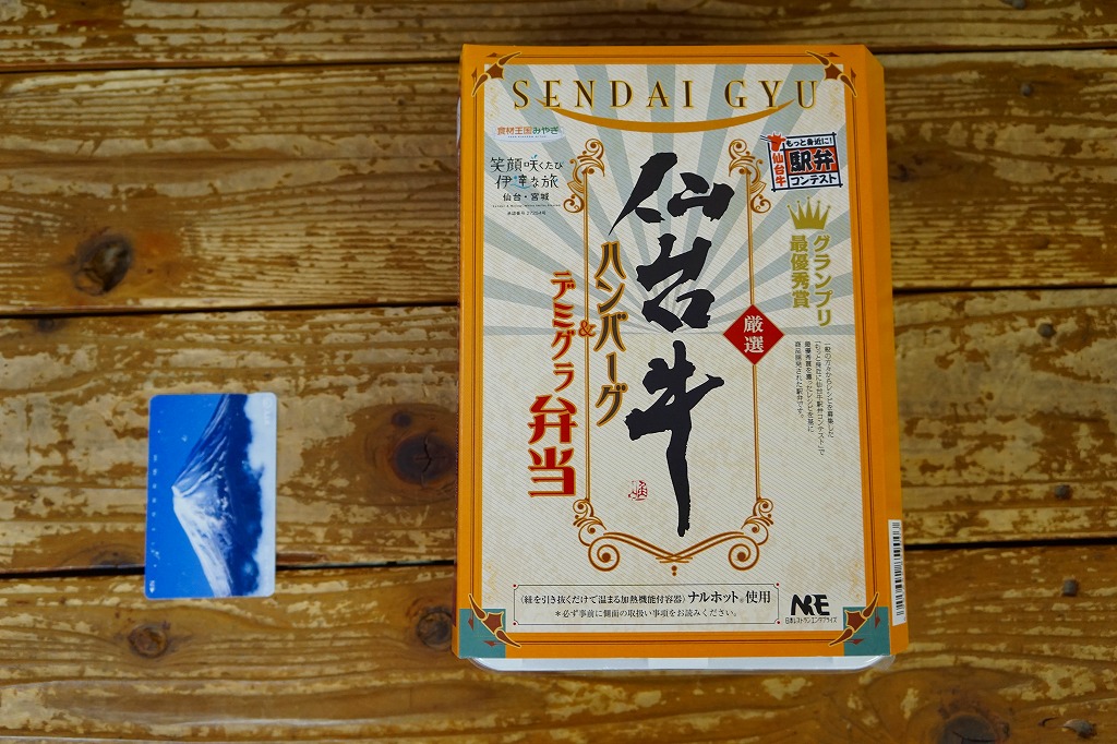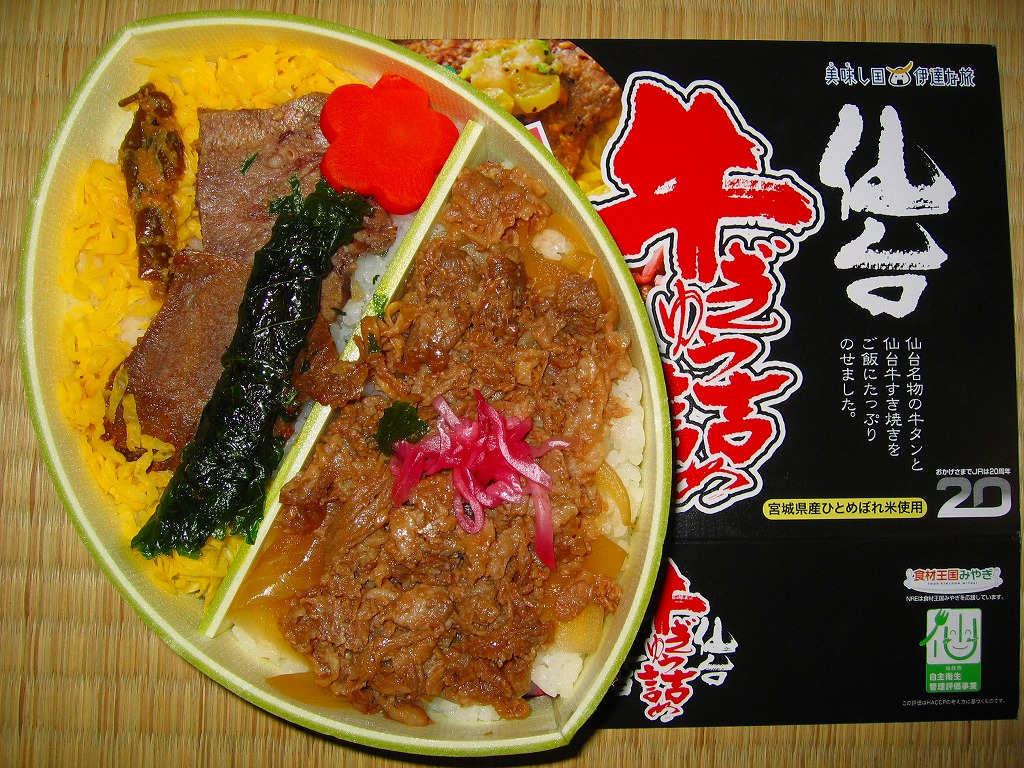 仙台箪笥(たんす)をイメージしたという、しかし頑丈ではない長方形のボール紙容器を使用、中身は御飯の上に宮城県産日高見牛甘辛煮が、ネギやゴボウやコンニャクや人参とともに載り、玉子焼きとナス漬とタクアンが添えられる。地域色を感じ取り難い名前や内容に、そこそこ美味い牛肉にそこそこ素っ気ないパッケージで、全体的に期待を上回らないし、下回らない。現存しない模様。