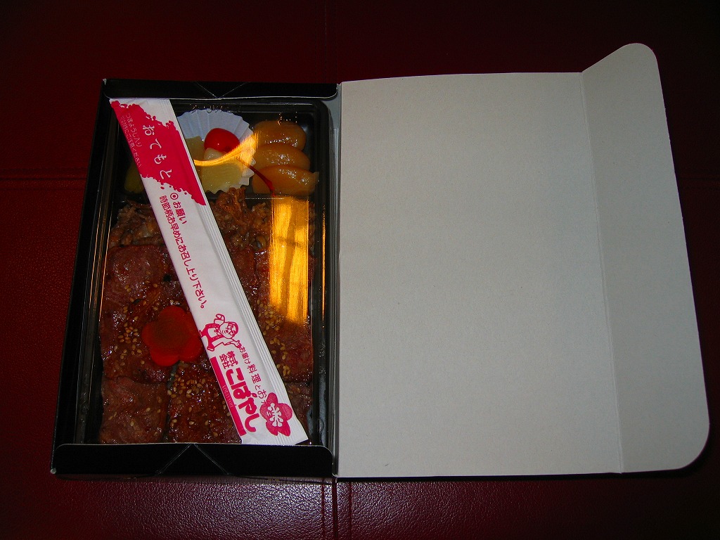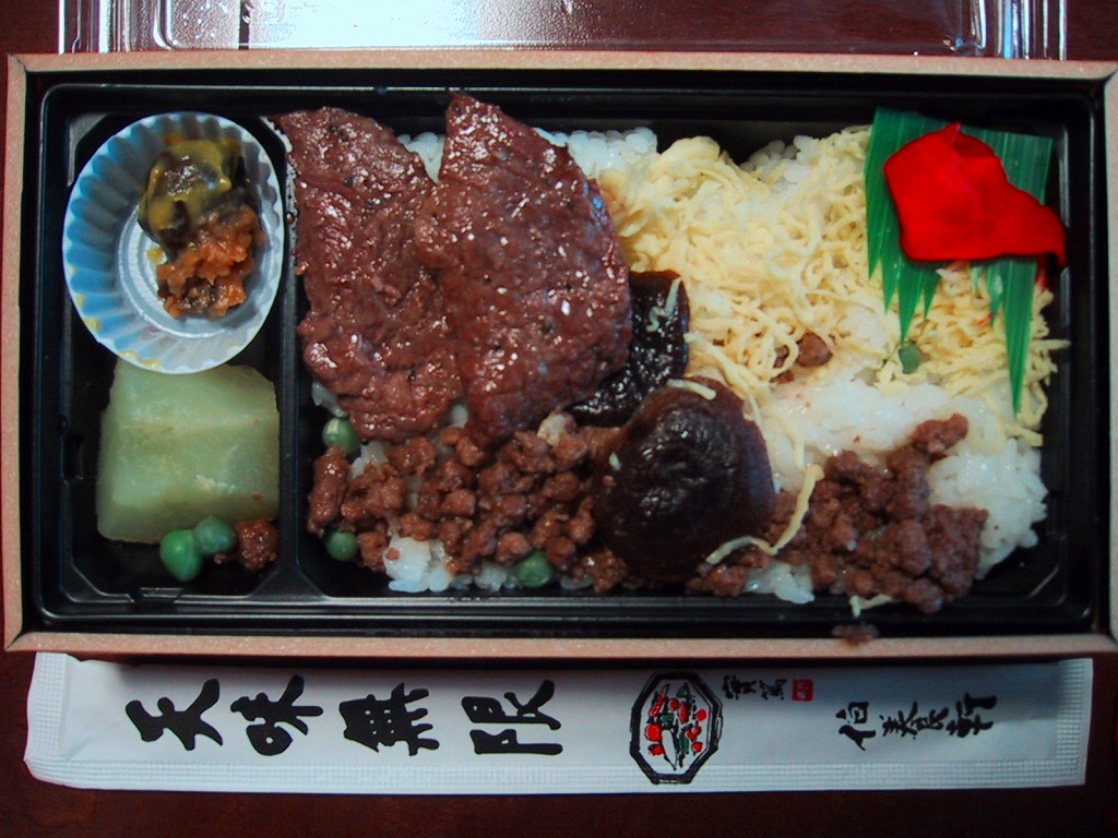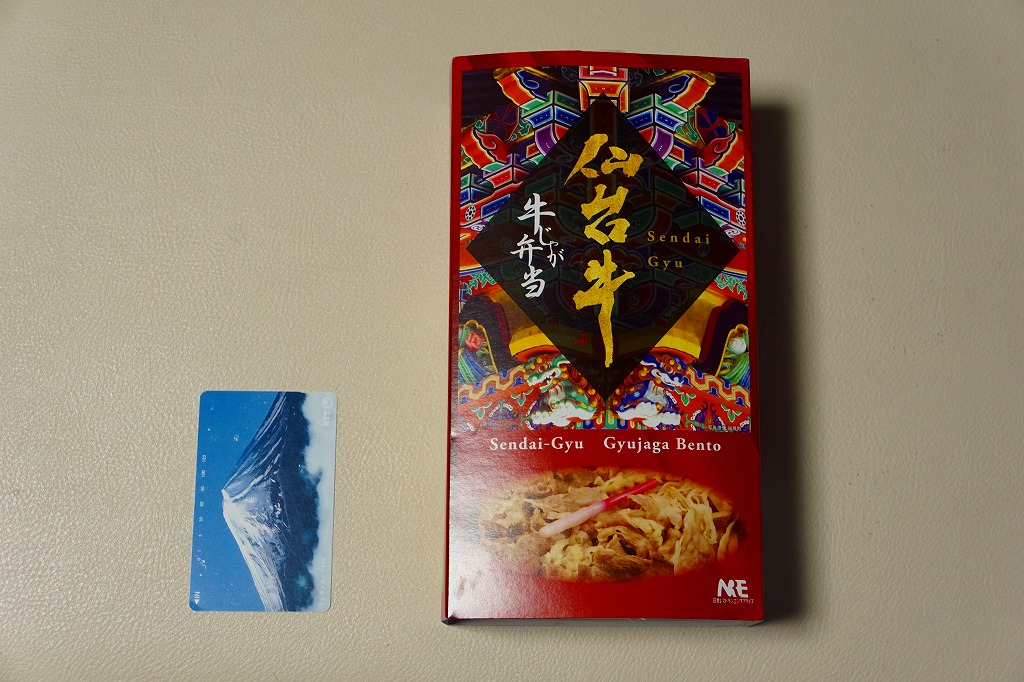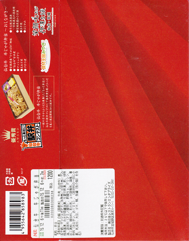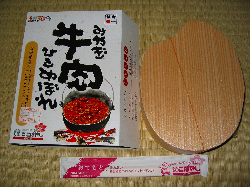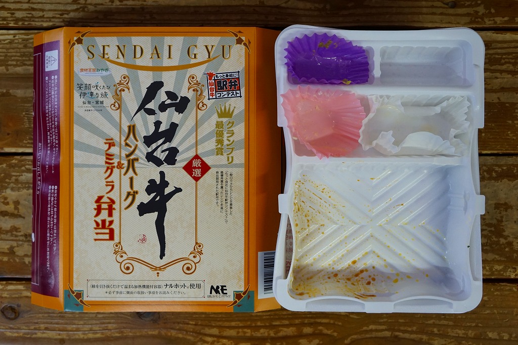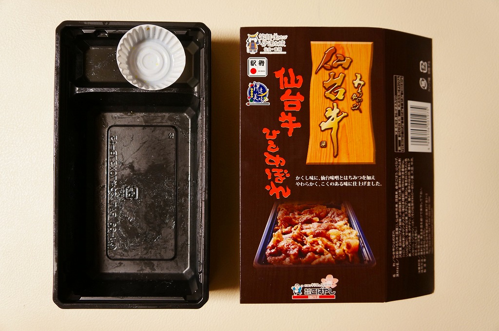 仙台箪笥(たんす)をイメージしたという、しかし頑丈ではない長方形のボール紙容器を使用、中身は御飯の上に宮城県産日高見牛甘辛煮が、ネギやゴボウやコンニャクや人参とともに載り、玉子焼きとナス漬とタクアンが添えられる。地域色を感じ取り難い名前や内容に、そこそこ美味い牛肉にそこそこ素っ気ないパッケージで、全体的に期待を上回らないし、下回らない。現存しない模様。