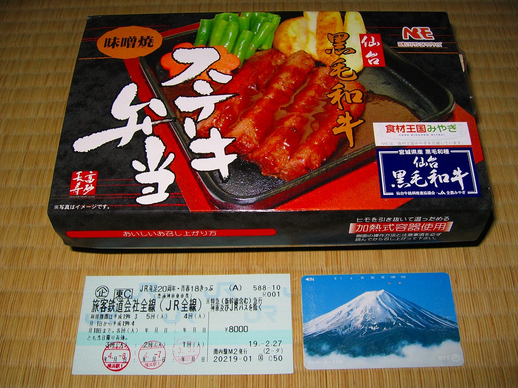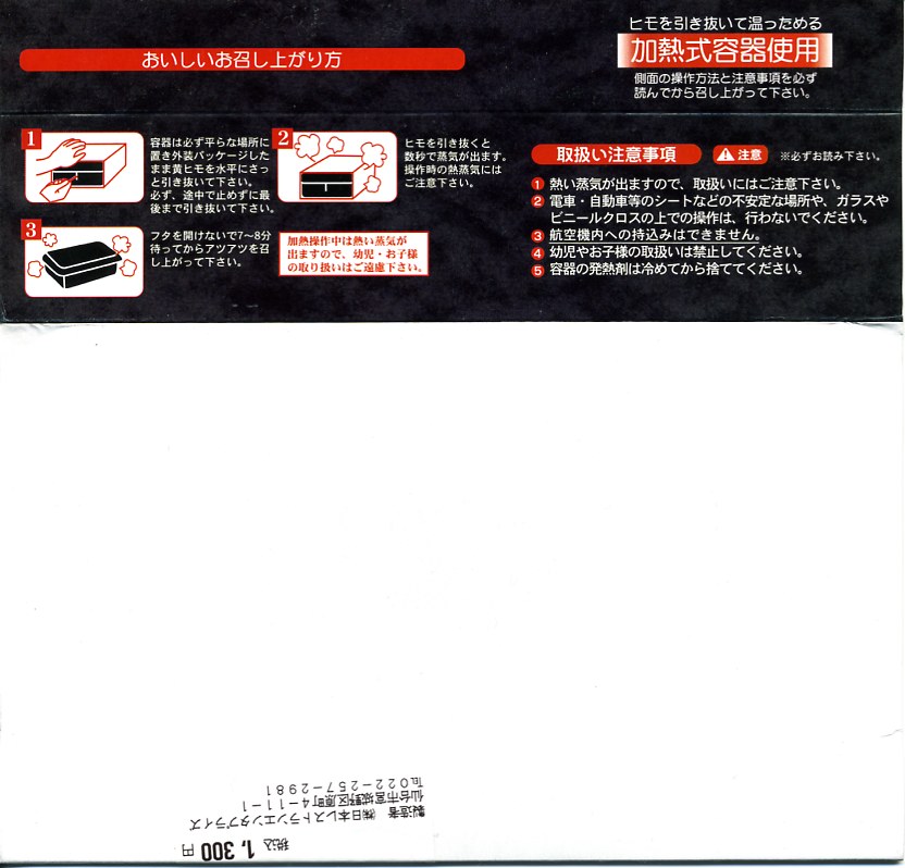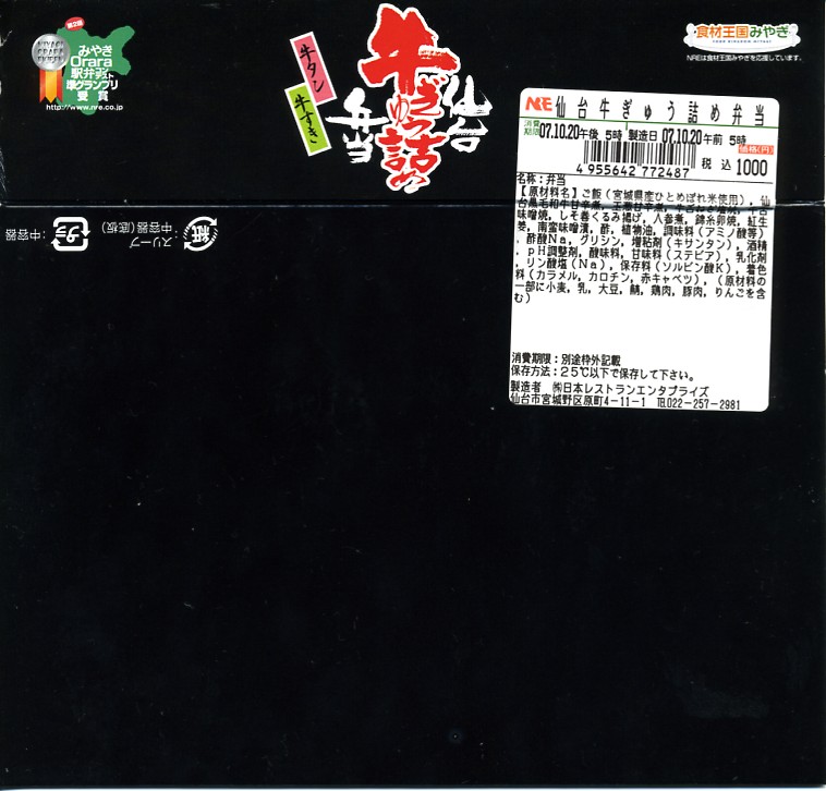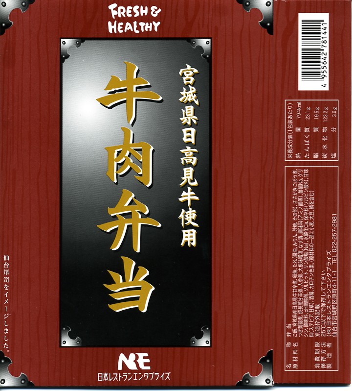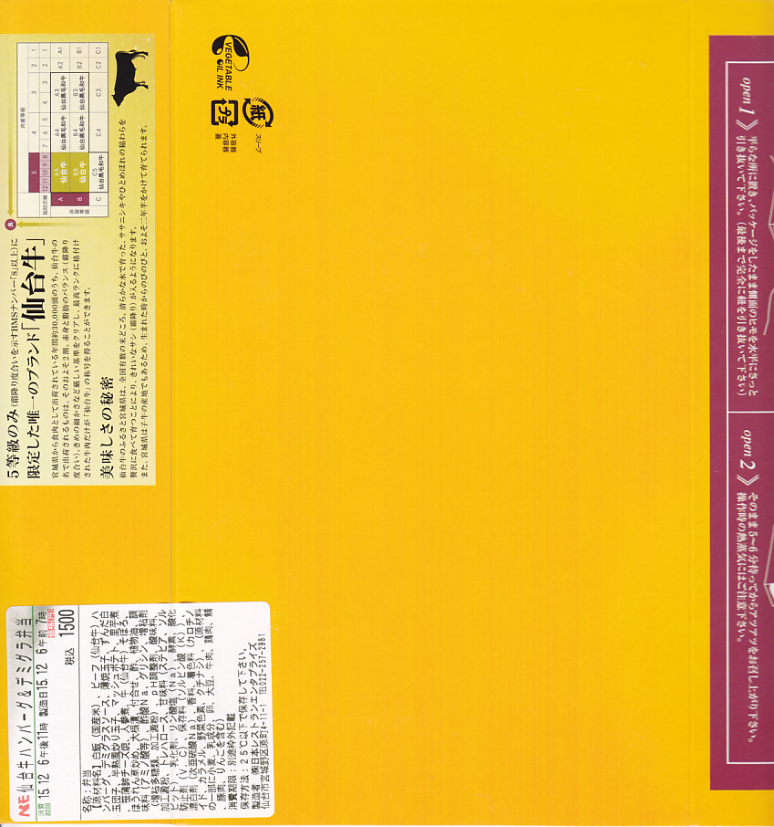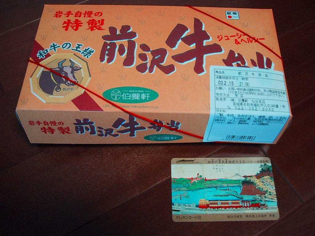 仙台箪笥(たんす)をイメージしたという、しかし頑丈ではない長方形のボール紙容器を使用、中身は御飯の上に宮城県産日高見牛甘辛煮が、ネギやゴボウやコンニャクや人参とともに載り、玉子焼きとナス漬とタクアンが添えられる。地域色を感じ取り難い名前や内容に、そこそこ美味い牛肉にそこそこ素っ気ないパッケージで、全体的に期待を上回らないし、下回らない。現存しない模様。