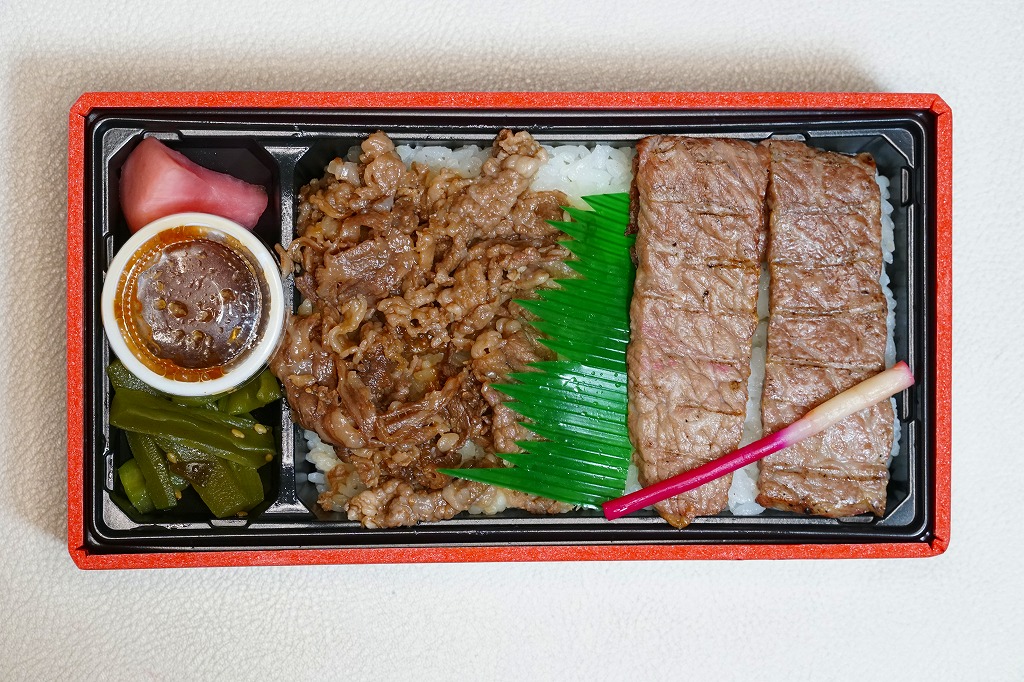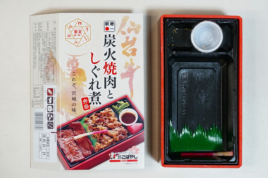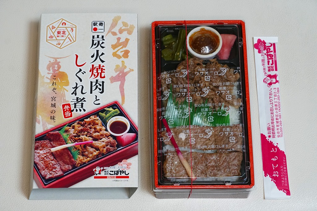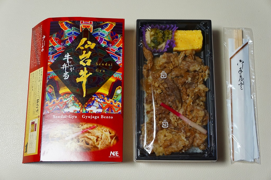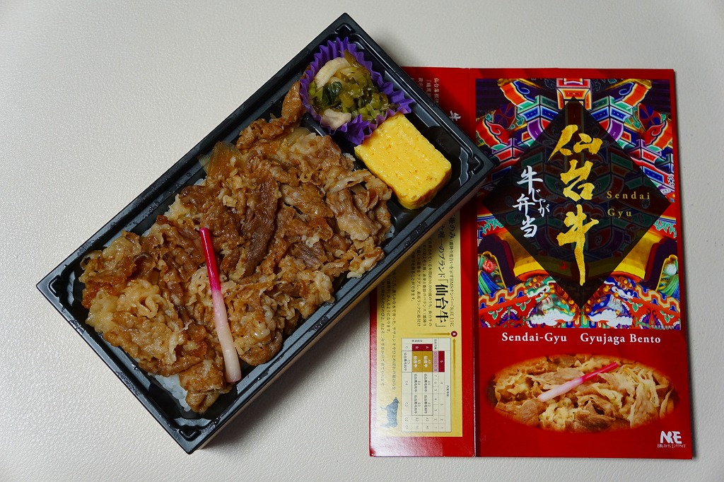 2021(令和3)年4月に仙台駅で発売か。中身はスリーブの写真のとおり、長方形のプラ容器に白飯を敷き、仙台牛の炭火焼肉と、仙台牛しぐれ煮で半分ずつ覆い、バランとはじかみで彩り、ステーキソースと山くらげと紅大根を添える。黒毛和種、宮城県内肥育、市場等に出品、規格A5またはB5と定義される仙台牛とそれ以外のブランド牛を食べて区別することは無理でも、中身に仙台を感じなくても、これはおいしい牛肉駅弁。2023年5月限りで終売。