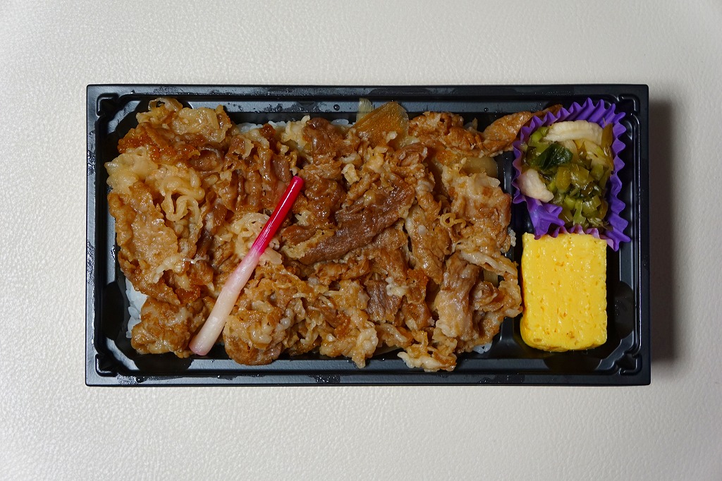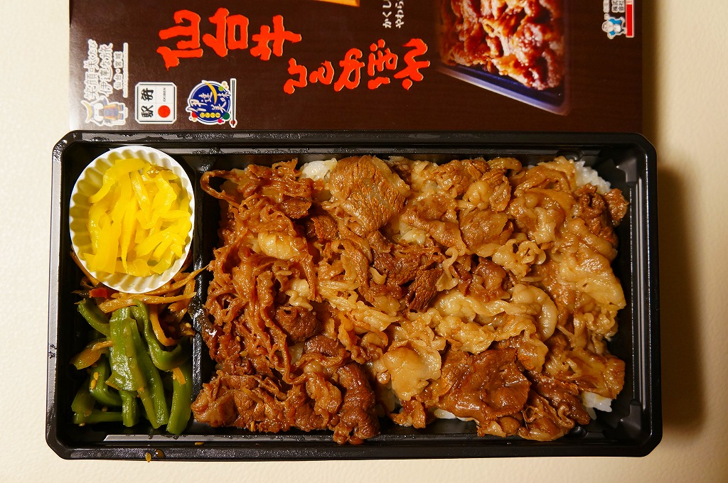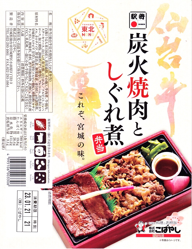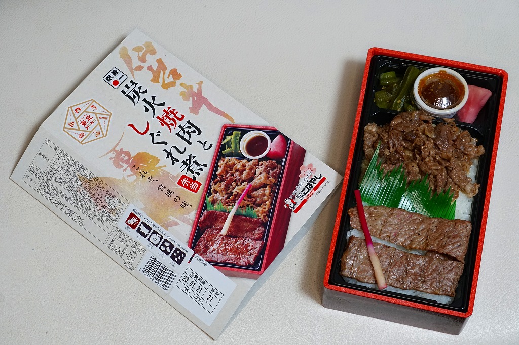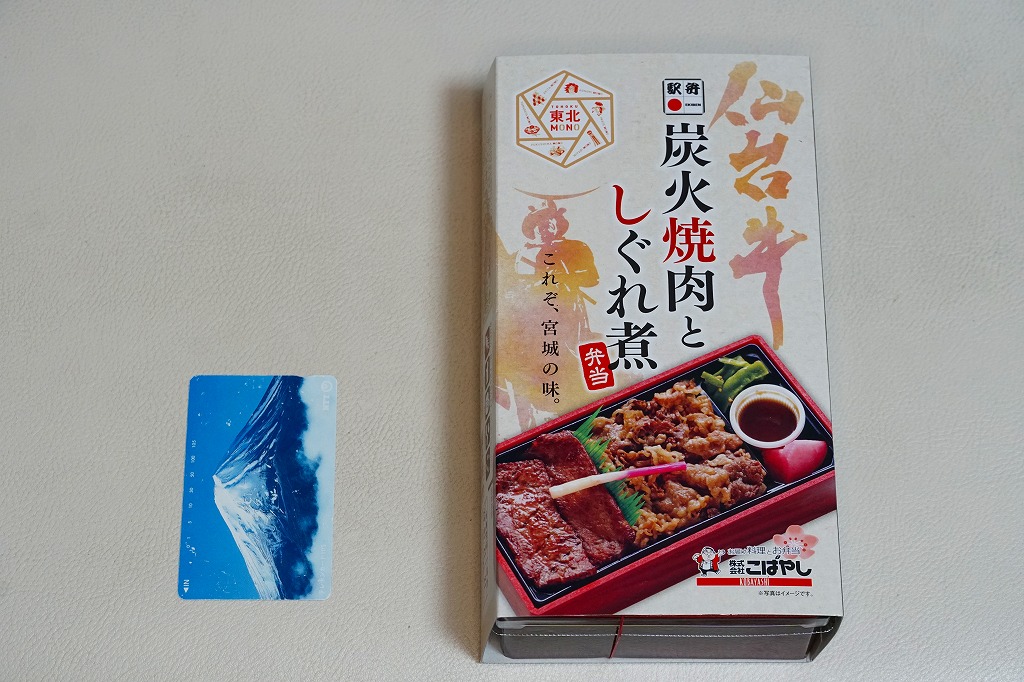 2021(令和3)年4月に仙台駅で発売か。中身はスリーブの写真のとおり、長方形のプラ容器に白飯を敷き、仙台牛の炭火焼肉と、仙台牛しぐれ煮で半分ずつ覆い、バランとはじかみで彩り、ステーキソースと山くらげと紅大根を添える。黒毛和種、宮城県内肥育、市場等に出品、規格A5またはB5と定義される仙台牛とそれ以外のブランド牛を食べて区別することは無理でも、中身に仙台を感じなくても、これはおいしい牛肉駅弁。2023年5月限りで終売。