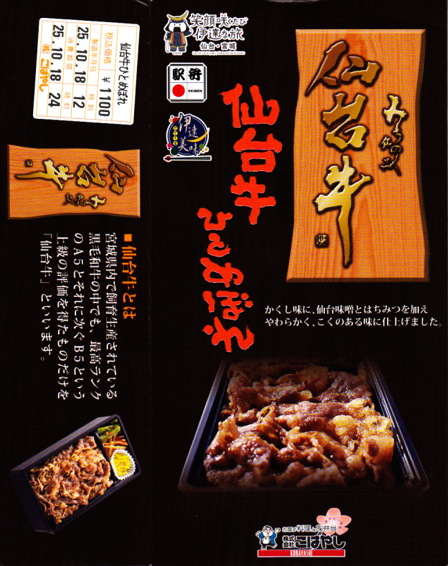 2008(平成20)年に発売か。黒いトレーを収める黒い紙箱を輪ゴムで留める。中身は宮城米ひとめぼれの白御飯の上を宮城県産牛のニンニク風味な照焼としぐれ煮で覆い、パイナップルとさくらんぼとピクルスと煮豆を添えるもの。お肉たっぷりの牛肉弁当で、風味や食感はなぜかなんとなく仙台の牛たん駅弁。この商品は首都圏へ積極的に輸送されており、パッケージにはレンジでの加熱を勧める記述もある。価格は2008年の購入時で1,100円、2010年時点で1,000円、2014年時点で1,050円。2014年頃までの販売か。