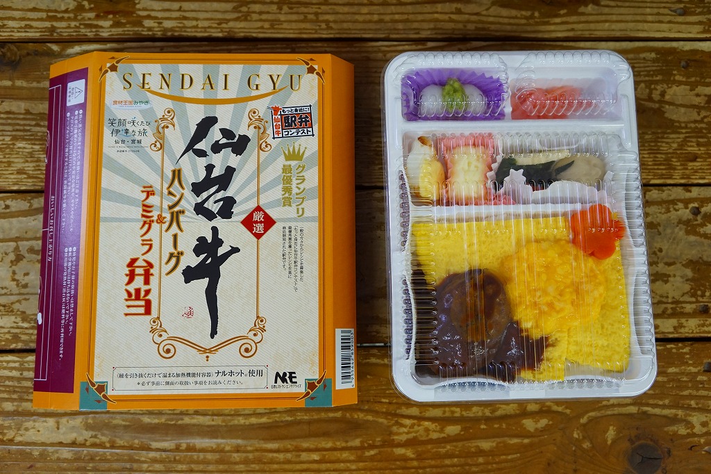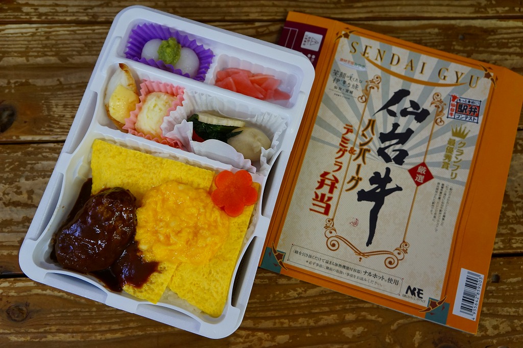 長方形の加熱機能付き容器を使用、中身は白御飯を薄焼き玉子で覆い、仙台牛ハンバーグのデミグラスソース漬け、ニンジン、半熟風炒り卵を載せ、マッシュポテト、笹かまぼこのチーズ載せ、サトイモ煮やホウレンソウ炒め、ずんだ白玉団子などを添えるもの。加熱式駅弁にしては多様な、えらく高価で、脈絡のない具を詰めたお弁当。