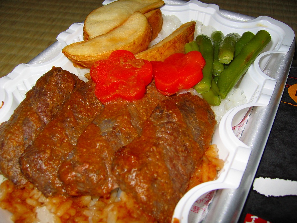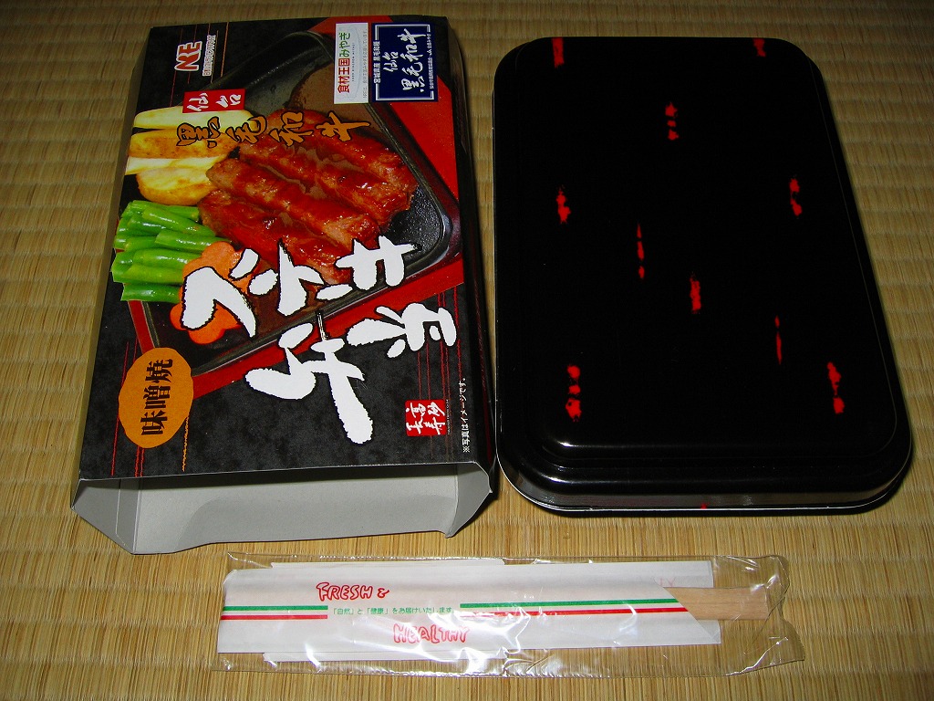2006(平成18)年7月1日に発売。長方形の加熱機能付き容器を、中身の写真が大きな紙枠にはめる。中身はその写真と比べて具の分量を3分の2ほどにした、牛ステーキ味噌焼4切れとフライドポテトにインゲンと花ニンジンが、白御飯の上に載るもの。