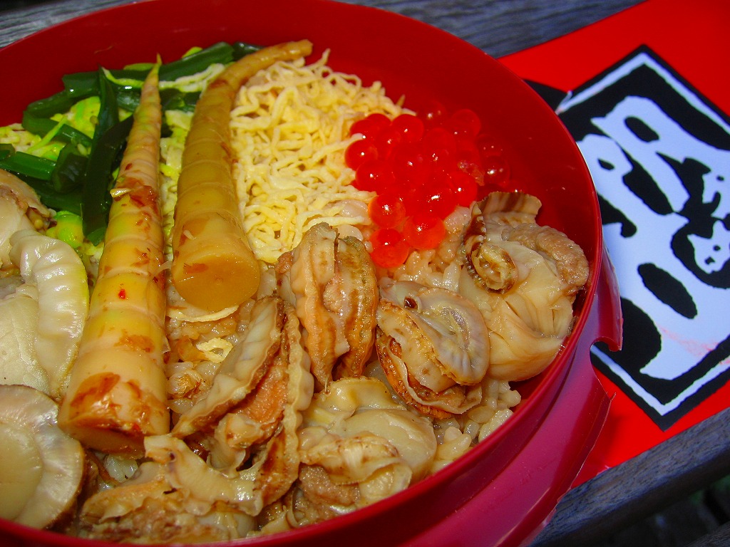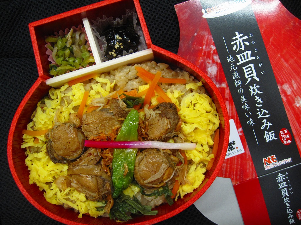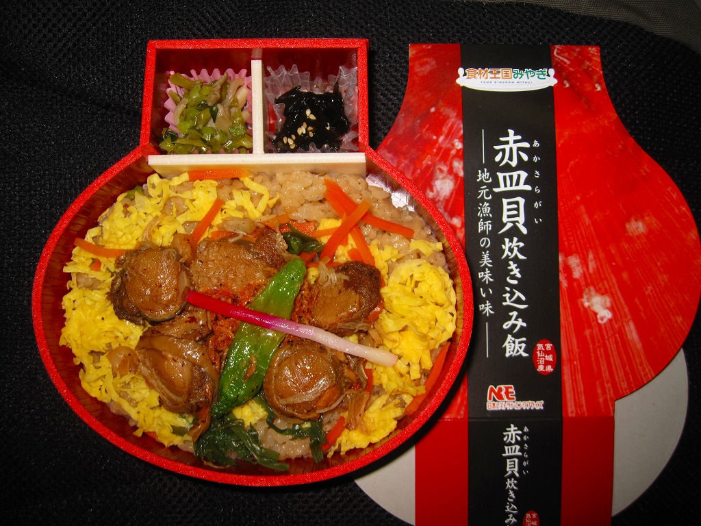 2011(平成23)年6月3日から、仙台駅で6000個限定で販売。アカザラガイ型というかホタテ型の赤い発泡材製容器を、貝殻の柄を持つ同じ形のボール紙の枠にはめる。中身はアカザラガイを炊き込んだ五目飯にアカザラガイのしぐれ煮を載せ、ニンジンやししとうや錦糸卵などで彩り、昆布佃煮とセリ調味漬を添えるもの。味こそホタテのB〜C級品という印象だが、これも面白い味。赤い容器の形状や中身の見栄えも良い感じ。