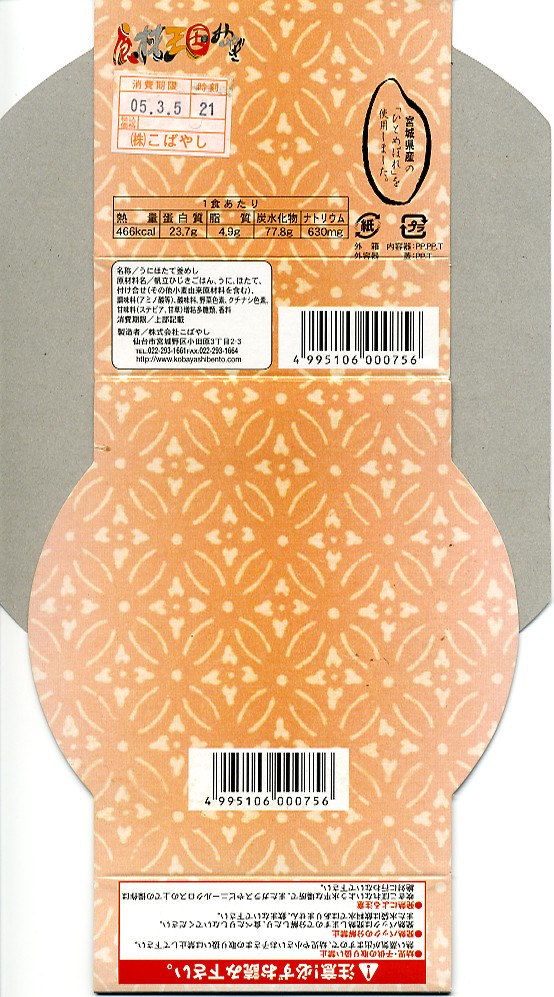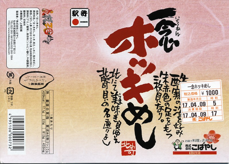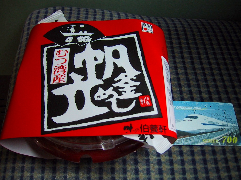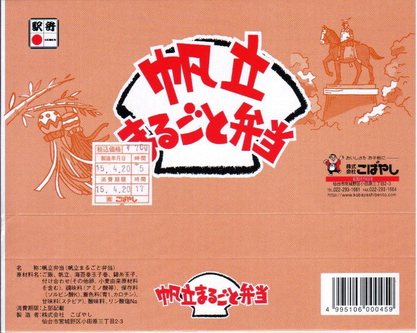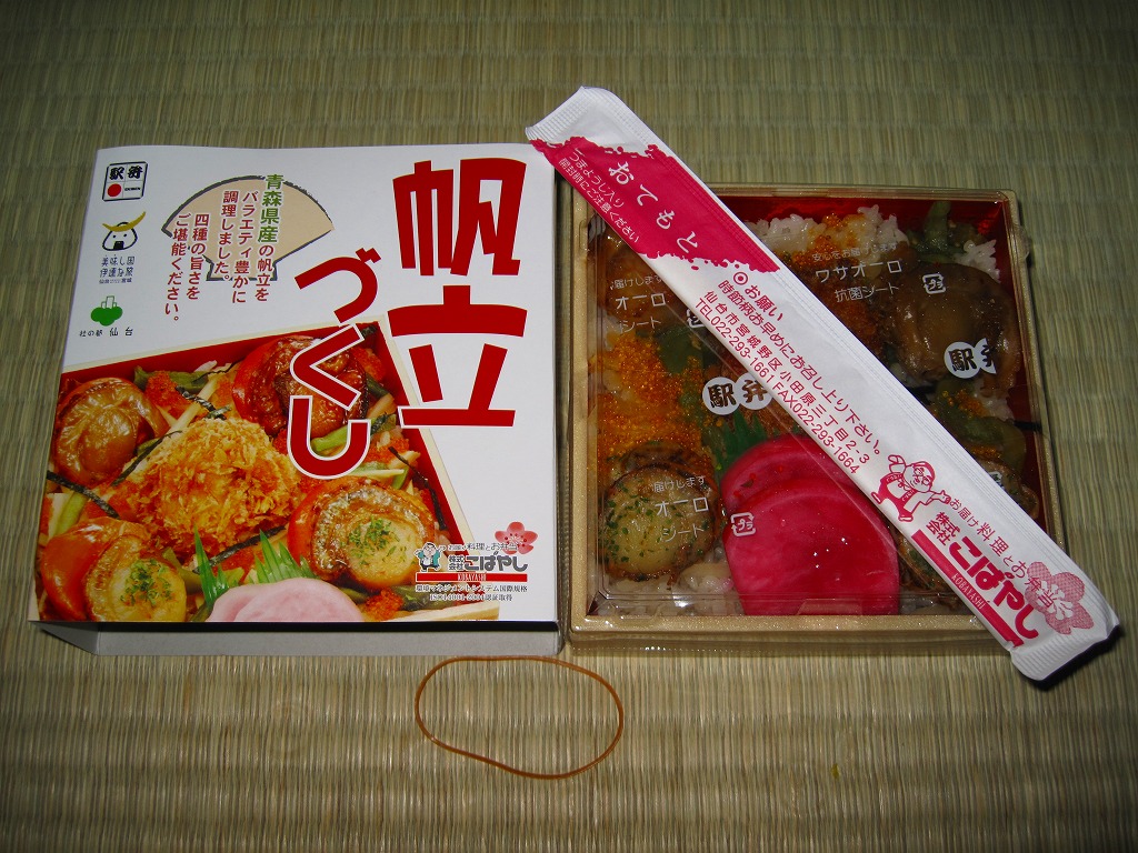 発泡材枠にトレーを接着した容器をボール紙の枠にはめる、JR東日本エリアでよく見掛けるゴミ減量型容器。御飯の上に厚みのある、程良い甘辛さの煮帆立を5個載せている。この内容の駅弁が700円とはさすが仙台で、モリモリ食べられるファストフード系駅弁。2007年頃までの販売か。