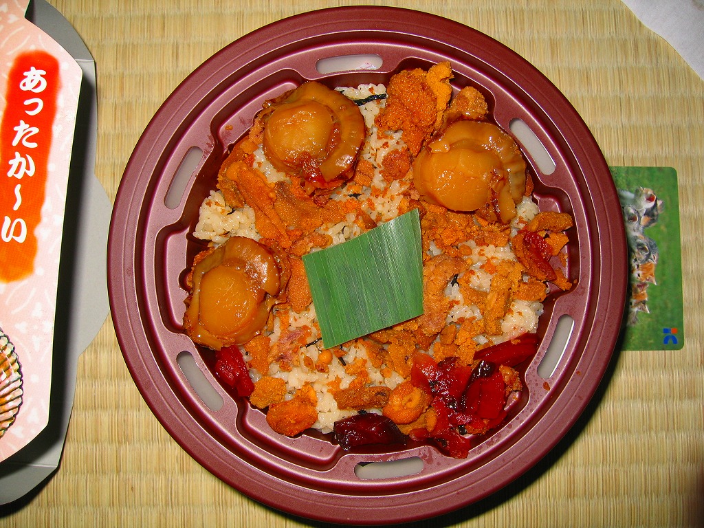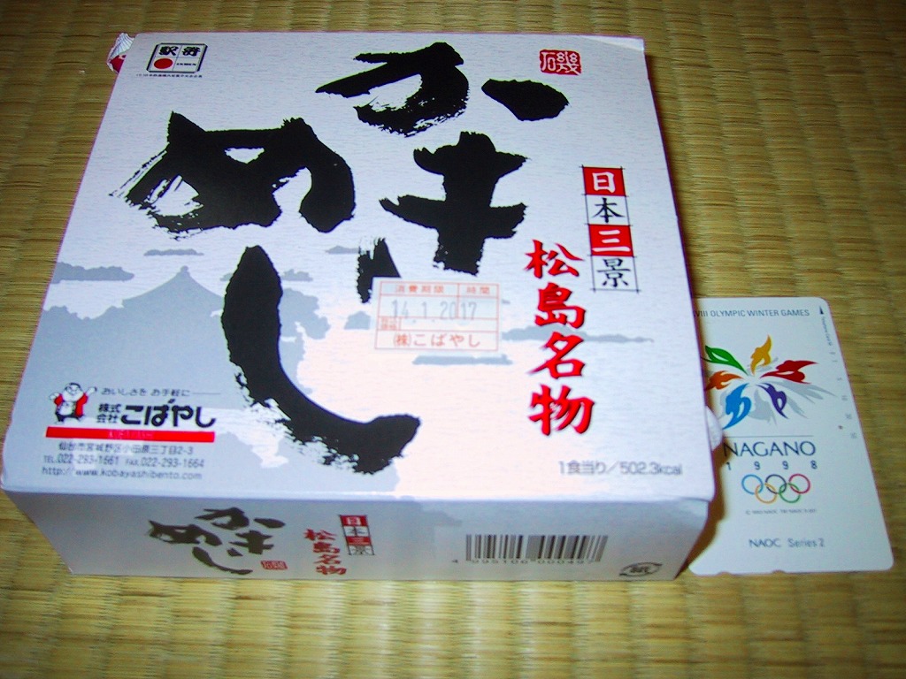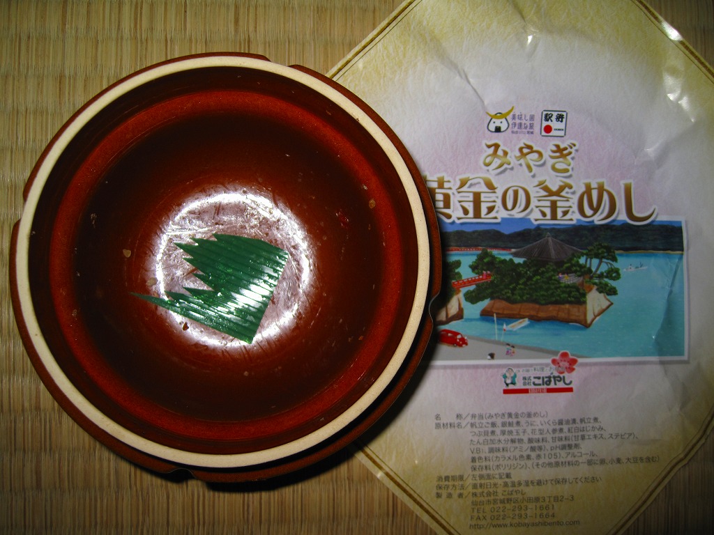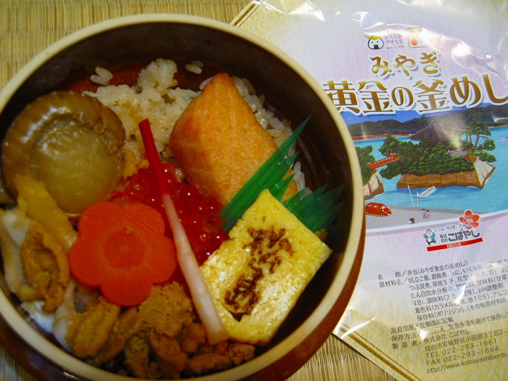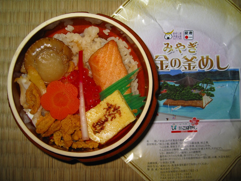 2010(平成22)年秋の新作として、2010年10月9日から11日まで東京駅で開催された「第12回東日本縦断駅弁大会(秋)」で発売か。今の仙台駅では珍しく陶製の釜型容器を使用、なんとなく松島を描いた正方形の掛紙で包む。中身はホタテ御飯の上にホタテ煮、銀鮭煮、蒸しウニ、イクラ醤油漬、つぶ貝、「松島」の焼き印を捺した玉子焼、ニンジン、はじかみを載せるもの。風味はいつもの、そしてさすがの仙台駅弁。1年間ほどの販売か。